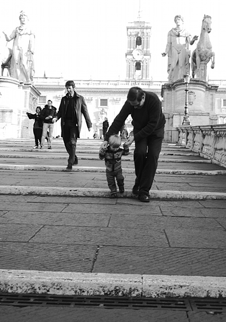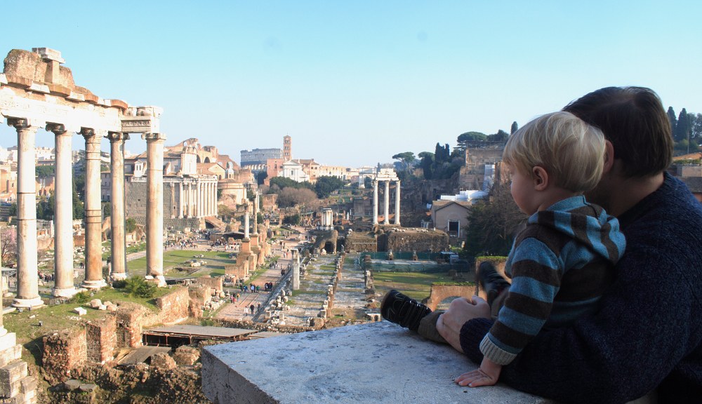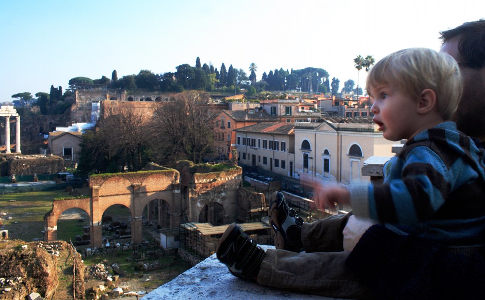 Heute Mittag wollten wir Albert ein neues Spielzeug kaufen. Das haben wir nicht wirklich geschafft. Allerdings haben wir Albert zwei paar Schuhe kaufen können (hoch lebe der Winterschlussverkauf) und er hat sich halbe Ewigkeiten in dem Spielhaus im Chicco-Laden versteckt. Er wollte partout nicht mehr rauskommen. War gar nicht so einfach, ihm die Schuhe anzuprobieren! Auch wenn der Laden keinen Wickeltisch hatte (trotzdem er ein reiner Babyaustatter ist), haben wir doch die Personaltoilette fuer den Windelwechsel angeboten bekommen – echt nett! Später hat Albert eine kleine Einfuehrung zum Forum Romanum erzählt und eine prächtige Aussicht gehabt. Heute ging es dem jungen Mann schon etwas besser. Zwar waren wir immer noch auf Paracetamol angewiesen, aber das Fieber war nicht mehr hoch.