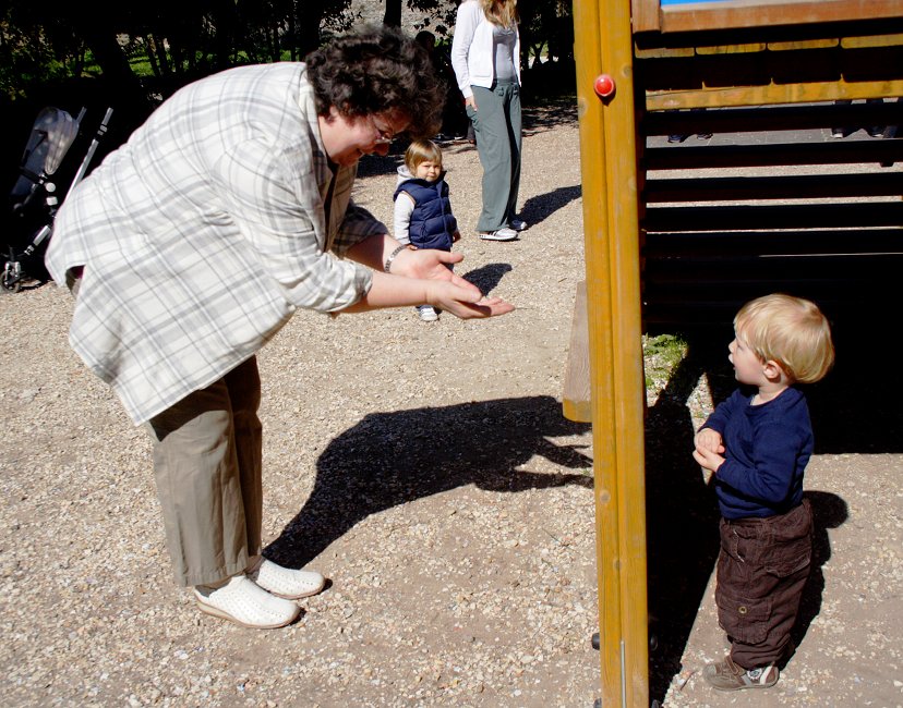 Oma ist da! Ich nenne sie „Oa“. Heute wollte sie mir von dem Buch mit der kleinen Katze vorlesen. Ich habe aber nicht zugehört, sondern ein anderes Buch angeschaut in dem ganz viele „dn-dn“ (Zuege) sind. Da musste Oma alleine die Geschichte mit der kleinen Katze lesen. Im Park bin ich ganz viel rumgerannt, bin gerutscht, habe geschaukelt und die Platiktassen von kleinen Mädchen zum Steinchenschaufeln benutzt. Oma konnte endlich mit eigenen Augen sehen was ich so alles kann!