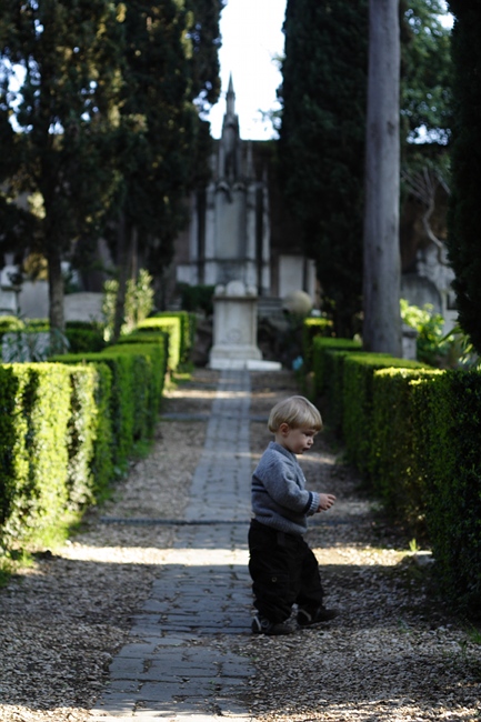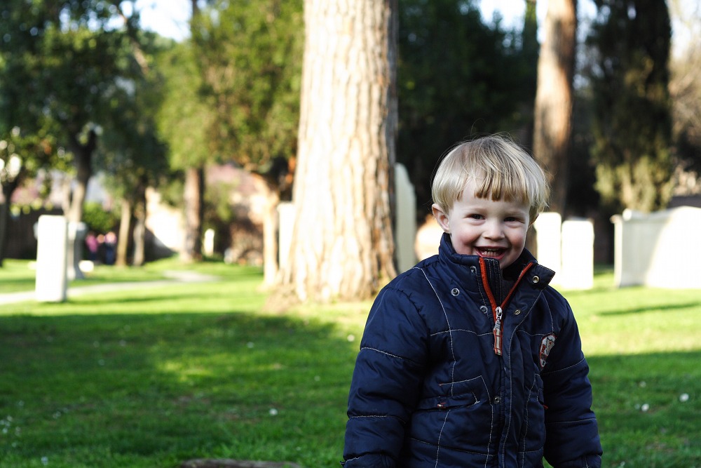 Heute Nachmittag gab es ein bisschen Sonne und ein bisschen Spass auf dem prostestantischen Friedhof. Wir hatten wirklich eine schöne Zeit dort! Albert rannte durch die engen Passagen zwischen den Gräbern entlang, sagte „bebie“ zu einer Engelstatue, suchte ueberall nach „dla-dla“ (Wasser/Springbrunnen) und begann zu tanzen als ich das dudadudadudadee“-Lied sang (letztes Bild).