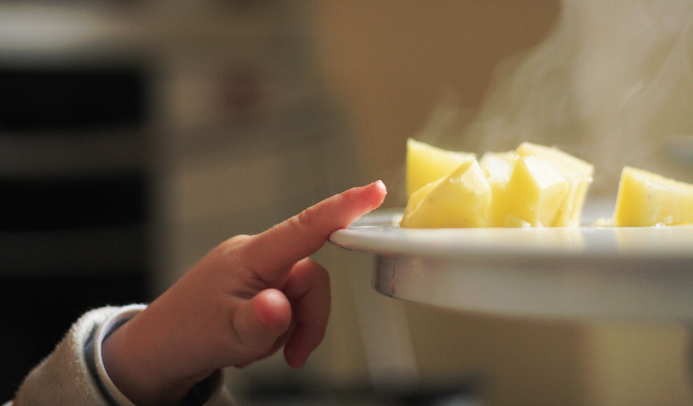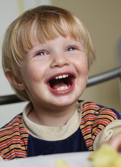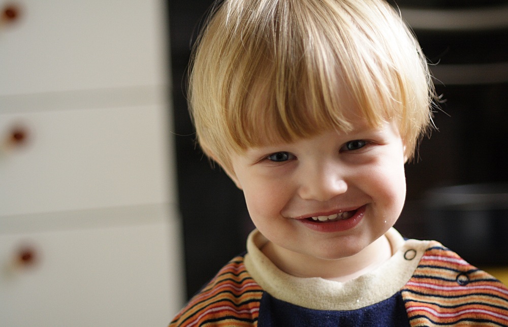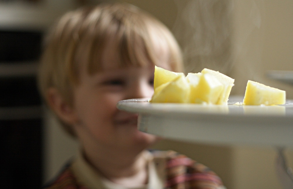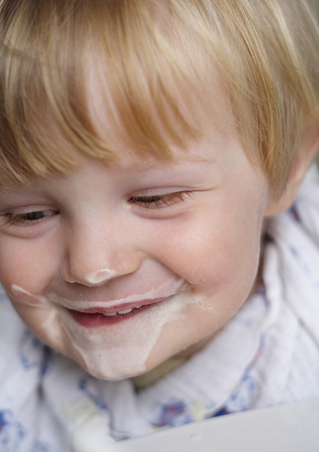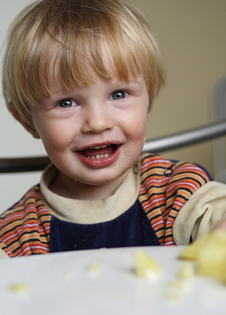 Der gestrige Abend verlief anders als geplant. Albert fiel aus seinem Zelt (das auf einem Gästebett steht) und war natuerlich erschrocken und dann auch hellewach. Obwohl er keinen weiteren Schaden genommen hatte, konnte er nicht mehr einschlafen, musste sich uebergeben und endete damit, dass er quietschvergnuegt ueber die Wohnzimmermoebel turnte und vom Einschlafen nichts mehr wissen wollte. Das war es dann mit meinen Plänen, den Abend mit Arbeiten zu verbringen. Als er im Bett war, war ich schon zu muede. Der Morgen begruesste mich mit Muedigkeit und Kopfschmerzen und so blieb ich so lange wie möglich in den Federn und bediente mich schlechter Pädagogik in dem ich Albert mit unzähligen Videos von Zuegen aus aller Welt erfreute. Als ich dann endlich aus dem Bett gekrochen war, hatten wir eine sehr angenehme Zeit in der Kueche. Albert half beim Kochen und distribuierte erst alle Kartoffelschalen auf dem Kuechenfussboden, sammelte sie dann auf und verteilte sie in unterschiedlichen Töpfen. Albert wollte dann Kartoffeln essen. Ich habe ihn fasziniert betrachtet als er versuchte, den Dampf von den Kartoffeln mit seinen Fingern zu verscheuchen. Wie du hier sehen kannst, hat er als Nachtisch Joghurt verspeist. Ich konnte mich nicht zurueckhalten mit dem Fotografieren! Dabei ist mir der Gedanke gekommen, dass ich, wenn ich hinter der Kamera bin, ihm viel mehr Raum lasse, Dinge auszuprobieren (und dabei Schweinereien zu veranstalten) und das ist – selbstverständlich nicht immer – eine weitere positive Auswirkung der Kamera.
