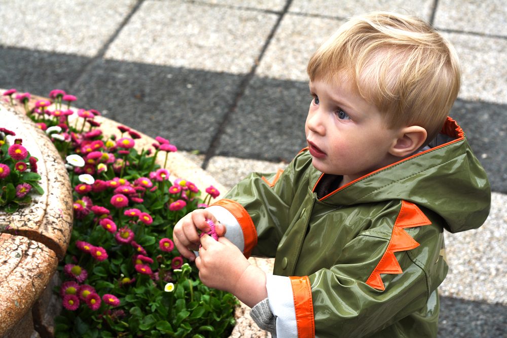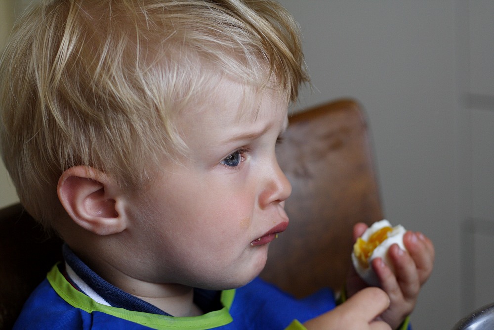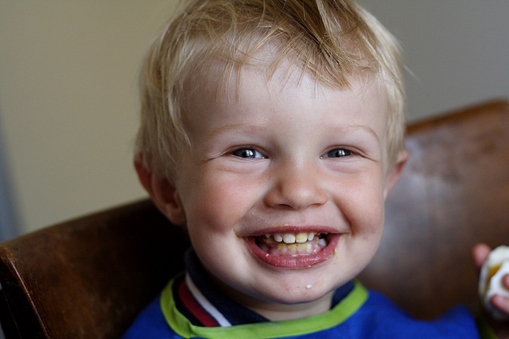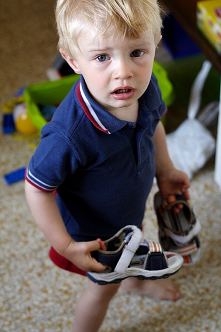 Dennoch, ich habe die Kamera in die Hand genommen und ein paar Fotos gemacht. Von Albert mit seinem Morgen-Ei („Ei“ ist eines seiner Lieblingswörter). Und mit seinen (neuen) Sandalen, die er mir mit eindeutigem Geknurr und Gewinsele brachte um mir, just als ich gerade etwas zu Mittagessen wollte, zu sagen, dass er JETZT UND SOFORT bitteschön rausgehen möchte. Zum selben Zweck bringt er uebrigens regelmässig die Sandalen und klopt sich mit der Hand auf den Mund um Indianergeheule nachzumachen, weil auf seinen Schuhen ein Indianerkopf abgebildet ist.