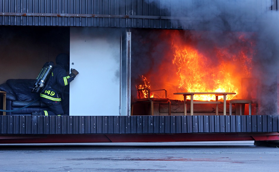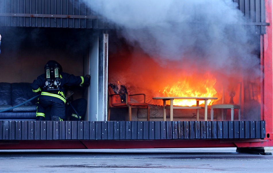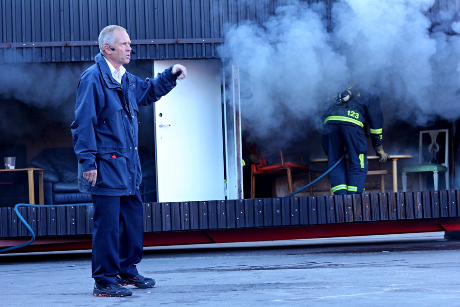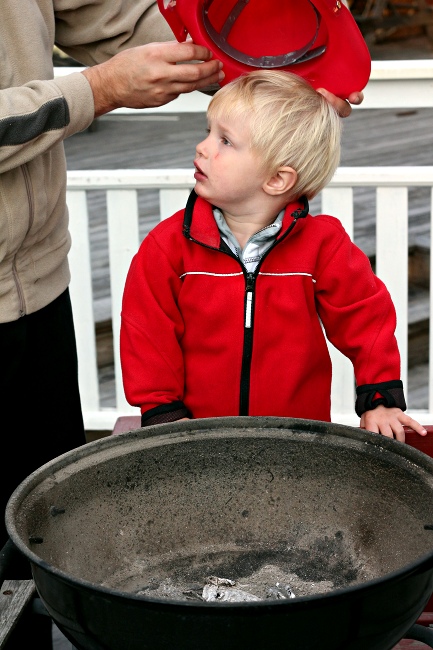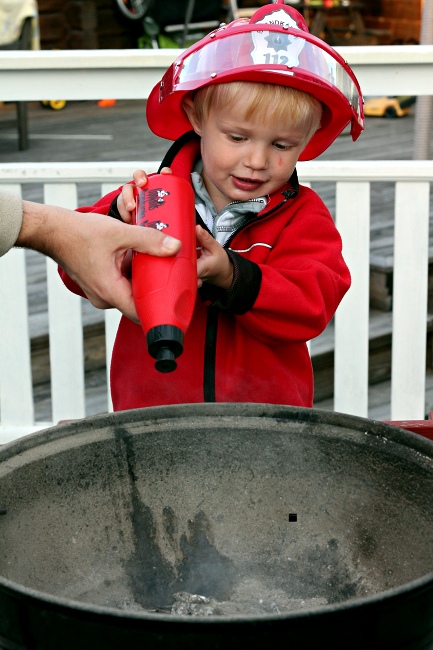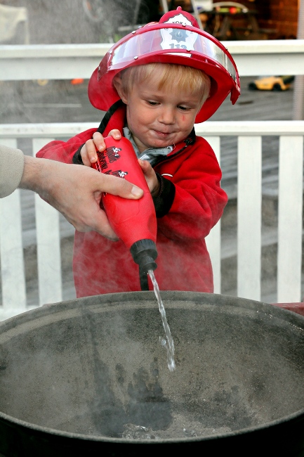 Feuerwehrmänner werden immer gebraucht. Ein Grill, der eben noch Wuerstchen gebräunt hat, möchte eine Dusche. Gut, da findet sich doch jemand.