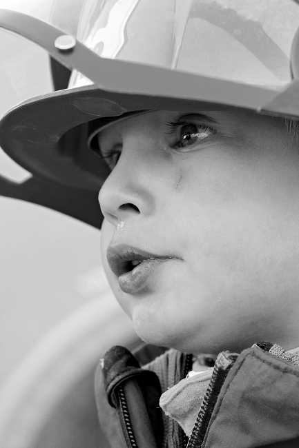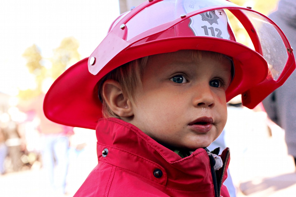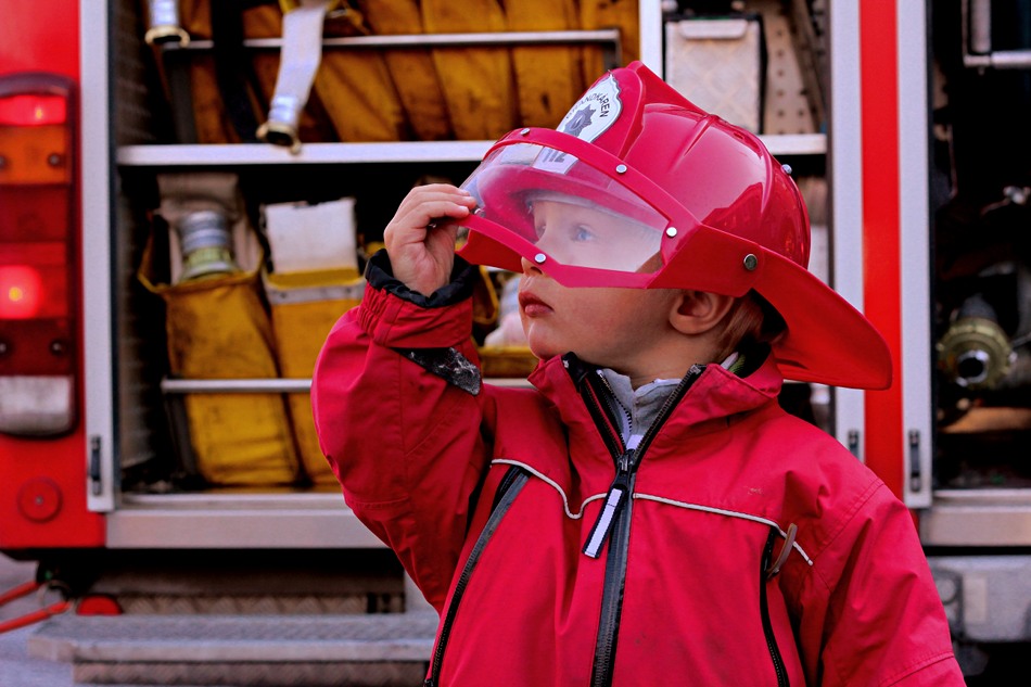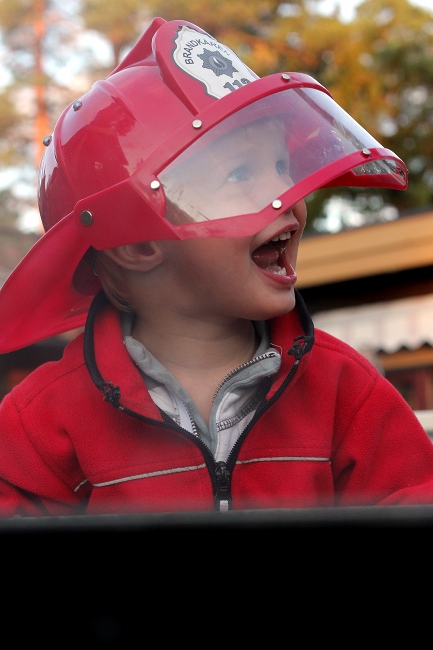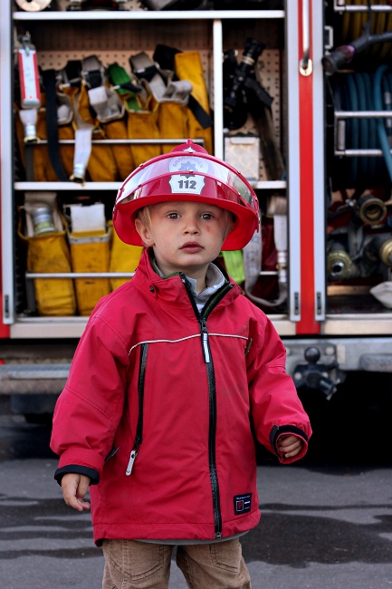 Also, vielleicht doch zuerst Flohmark. Oh, welch Glueck! Eine Feuerwehr mit Schaulöschen! Nachdem wir und die Augen aus dem Kopf gestaunt haben, wagen wir eine kurze Runde auf dem Flohmarkt. Oh, noch so ein Glueck! Ein Feuerwehrhelm fuer Kinder! Her damit! Aufgesetzt! Zurueck zur Feuerwehr! Lächeln auf den Gesichtern der Feuerwehrleute. Kind in rot mit Helm und grossen Augen.