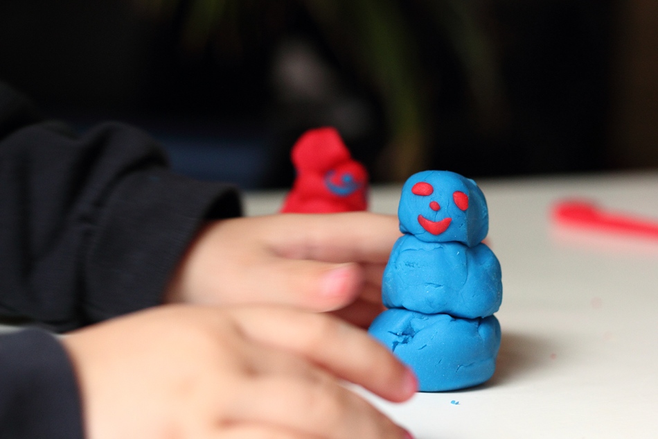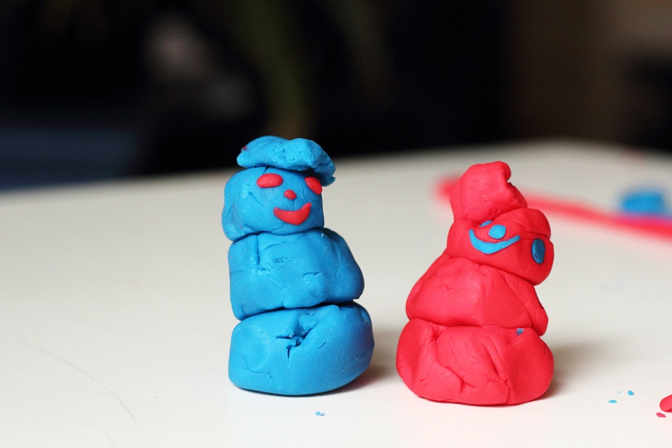 Um die gestern die Zeit möglichst glimpflich totzuschlagen (bis Papa nach Hause kam), haben wir geknetet. Besonders gut hat Albert meine Idee mit den Schneemännern gefallen. „Hó, hó (=Schnee, Schnee)!“, hat er immer wieder gesagt und nach draussen gedeutet! Dann habe ich ihn gefragt, was der Schneemann alles im Gesicht hat. „Munnnt, Naße, Szemet (=Augen)!“, meinte er. Warum sich nur einer Sprache bedienen, wenn man gleich mehrere zur Verfügung hat?