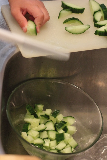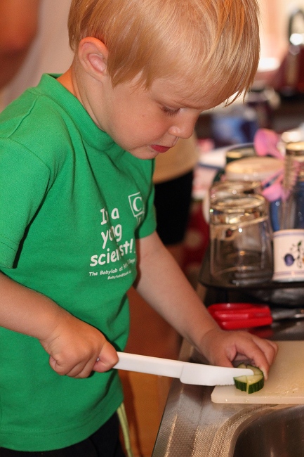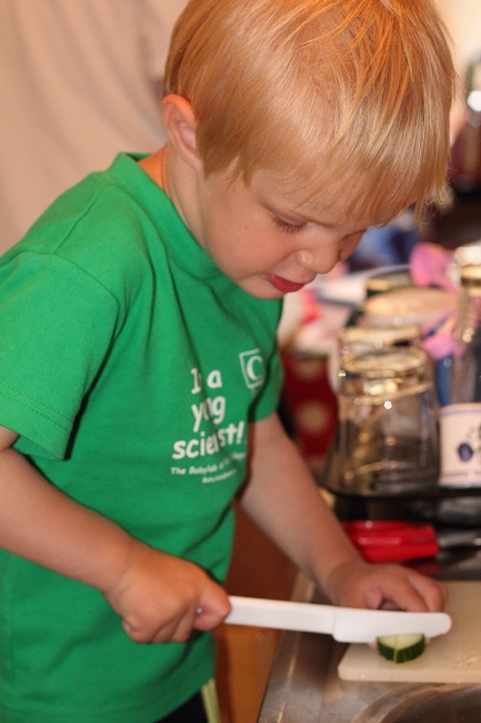 Albert liebt – nach wie vor – das Kochen. Heute hat er Gurke fuer einen griechischen Salat geschnitten. Papa hat Streifen vorgeschnitten und Albert hat sie zerkleinert. Wie man sieht, hat er die Schuessel schon fleissig damit gefuellt! Die Konzentration ist nicht zu uebersehen…