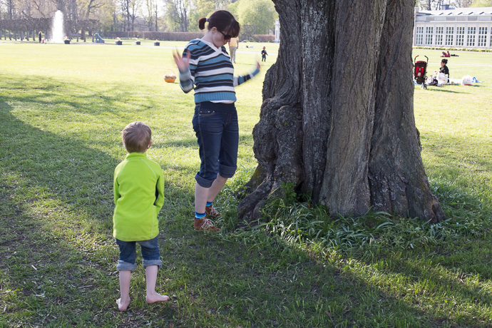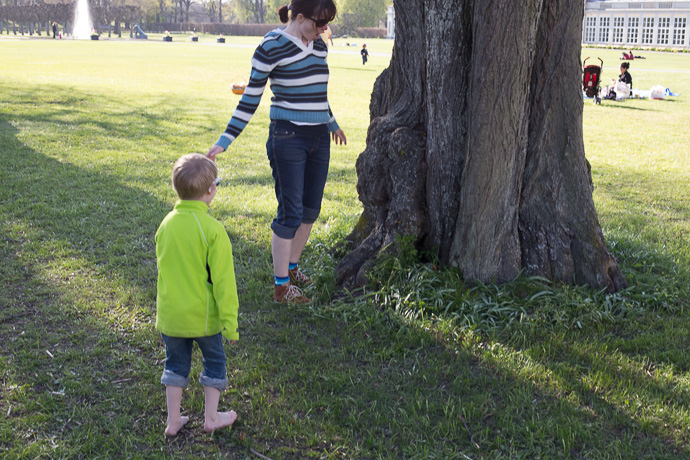 Ein anschliessendes Überraschungseier-Verstecken und -Suchen diente der Aufheiterung von Junior. Mama und Papa durften auch suchen (wie man sieht). Der Rückweg war etwas anstrengend, da wir den gemeinsam per Rad erledigten (auf dem Hinweg hatte ich den grössten Teil der Strecke mit Albert und Rad auf der Bahn verbracht). Ich bin völlig schlapp was Herz-Kreislauf-Kondition angeht und die hügelige Heimfahrt brachten mich – obwohl Albert bei Papa mitfuhr – ordentlich zum Schnaufen. Zuhause waren wir dann – alle ausser Albert – sofareif. Guter Ausflug, gutes Training. Aber ich war doch ganz froh, dass Montag nur Arbeitstag ohne Fahrradtour anstand ;-).