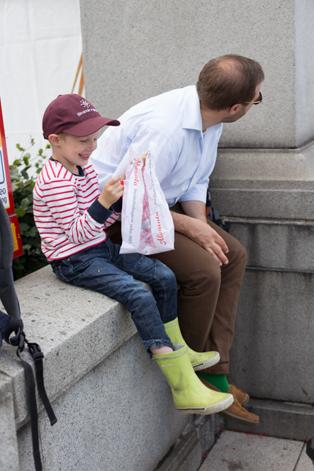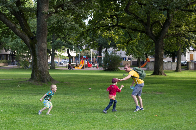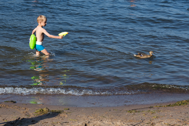Etwas später findet sich eine Ente ein, die engagiert auf Picknickdeckenzipfeln entlangrennt und ständig versucht, Kuchen zu stibitzen. Ich finde, dass kann sie gerne woanders tun und schlage Albert vor, dass er die Ente mit seiner Wasserpistole bespritzt und zur Migration Richtung Wasser ermutigt. Belustigt schaue ich ihm zu wie die Ente vorneweg wackelt, Albert hinterher mit seiner Wasserpistole. Harmloser Spass, denke ich. Der Spass hält nicht lange an. Die 31-jährige Musikliebhaberin á la „Musik und Natur“ von nebenan erkundigt sich, ob das Kind denn unseres wäre und dass sie fände, dass er die Ente stresst und dass das so nicht ginge. Ich weiss gar nicht, wie ich das nun verstehen soll uns sage gar nichts. András reagiert schnell und meint, sie könne das ja sehr gerne dem Albert selbst erklären. Das tut sie dann auch. Geht hin und redet mit ihm. Er hört zu, sagt was, sie geht wieder zurueck zur Picknickdecke. Dann kommt Albert zu Papa gelaufen und versteckt sich, sagt kein Wort, antwortet nicht, wenn man ihn fragt, was los ist und ich verstehe nicht, was das nun ist.