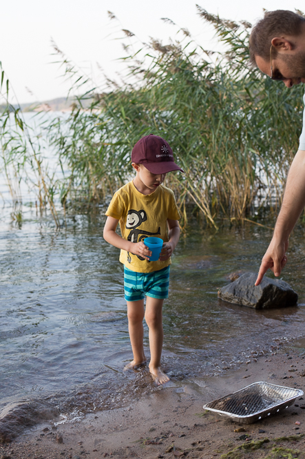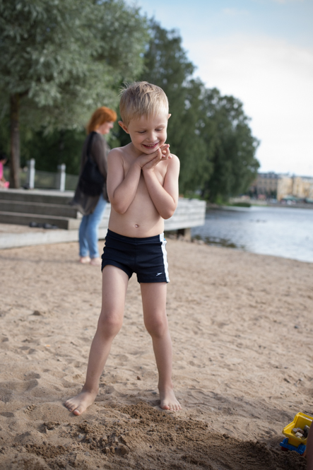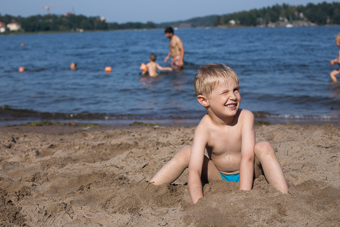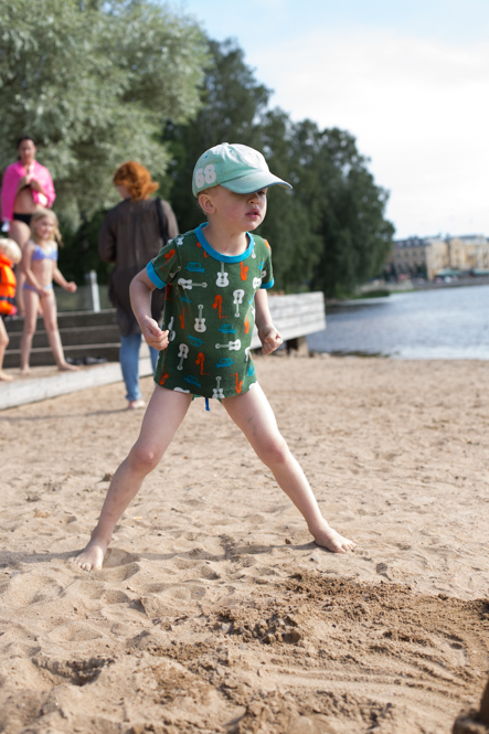 Als wir am Strand ankommen sitzt Papa schon im Grase und erfreut sich der Tatsache, dass neben vielen anderen Besuchern auch eine Truppe mit elektronischer Musik und Lautsprechern eingetroffen ist. Es gibt nicht nur Strand, es gibt auch Beschallung. Nun gut. Nach einer Weile frage ich mich stirnrunzelnd, ob ich wohl das einzige Wesen bin, das die Beats und die nuschelige tiefe Stimme aus der Konservendose stört. Langsam steigender Stresspegel in Korrelation mit zunehmender Lautstärke. Ich werde langsam wütend. Erfolglose Versuche, mir die Musik schönzureden. Standortwechsel, näher zum Wasser. Immer noch Musik. András macht einen diplomatischen Anlauf und fragt mal die Jungs mit der Musik freundlich, was denn so der musikalische Unterhaltungsplan für den Nachmittag wäre. Ob es denn mal eine Pause gäbe oder die Lautstärke weniger werden würde. Ich beobachte ihn, wie er mit einem nett aussehenden schwedischen ca. 25-jährigen im Ethnohemd spricht. Der klopft András freundlich auf die Schulter und ist die Ganzkörper-Variante von „Alles ist gut“. Nein, die Musik müsse kontinuierlich sein, denn das gehöre zum Konzept von der Musik im Einklang mit der Natur.