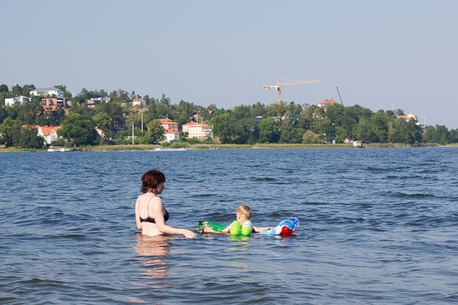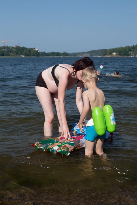 Nichts ist gut. Wütend stapfe ich zu der Truppe und sage, dass ich das sehr ärgerlich finde, dass man hier einfach so beschallt wird, ohne gefragt zu werden. Man wartet die ganze Woche darauf, mal für eine Weile kein „Mama, Mama“ zu hören, sondern den runden Bauch in die Sonne zu strecken, mit blinzelnden Augen Papa und Sohn beim Wasser zu sehen und ausser Gesprächsfetzen und Kinderstimmen keine weiteren auditiven Gipfelerlebnisse zu haben. Fast fange ich an zu heulen vor Entrüstung und die Jungs halten sich sehr tapfer, mich zu beschwichtigen. Ihre „Eins-mit-der-Natur-und-der-Musik-Philosophie“ leuchtet mir weniger ein und ich will mich nicht in den Trance tanzen oder warten, wann mich der Viervierteltakt weniger wütend macht. Die schwangere Tante wird beschwichtigt und die Musik für 2 Stunden leise gestellt. Der Adrenalinpegel senkt sich, spätestens nach einer kleinen Runde im Wasser. Ich bin den Jungs dankbar und insgeheim froh, dass ihre Philosophie von „Alle fühlen sich gut mit dieser unglaublich wunderbaren Musik in der Natur“ nicht mit meinem Unbehagen übereinstimmt. So mussten sie sich – zumindest zeitweise – ihrer eigenen Auffassung unterstellen.