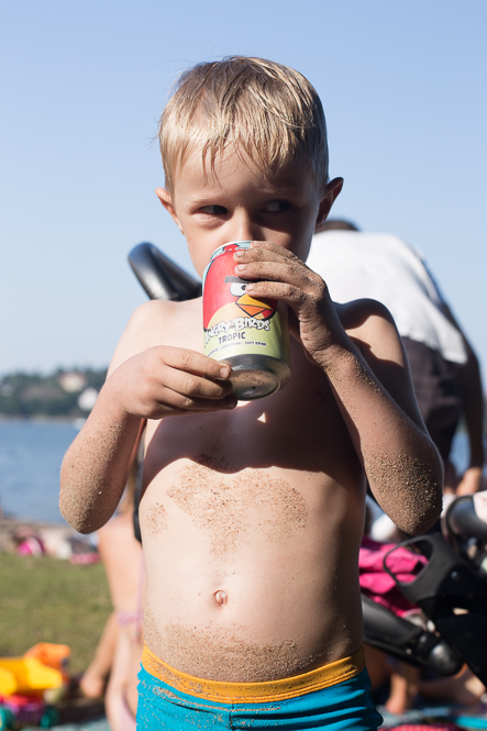 Es ist Sonntag. DER wunderbare Tag in der Woche, an dem Papa nicht arbeitet. Und wir wollen zum Strand. Bewaffnet mit der „Angry birds“-Luftmatratze und passendem Büchsengetränk (siehe Fotos) machen wir uns auf dem Weg, András auf dem Drahtesel, Albert und ich per Bus. Aus unerfindlichen Gründen und mütterlicher Verwirrtheit nehmen Albert und ich den falschen Bus, verpassen den Richtigen beim Umsteigeversuch und langweilen uns an der Haltestelle bis der nächste Bus kommt, Gott sei Dank mit Verspätung.