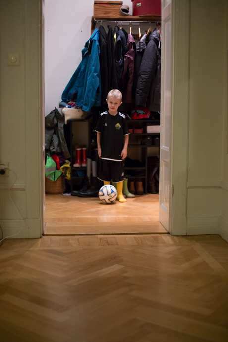 Albert zeigt stolz seine Trainingskleidung fuer den Fussball – viel zu gross, aber macht nix!! Samstag ist das erste Training!