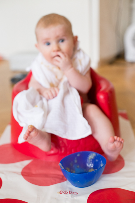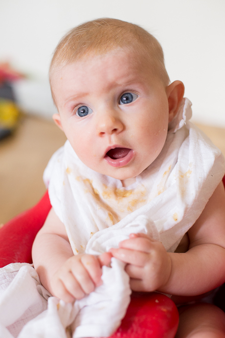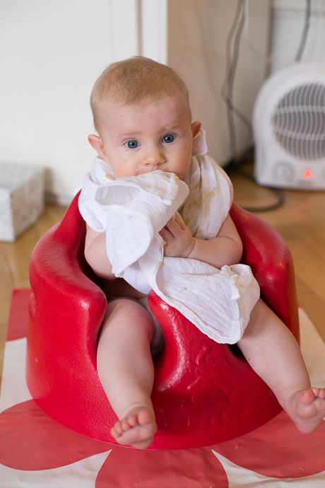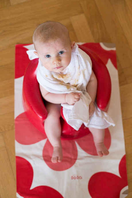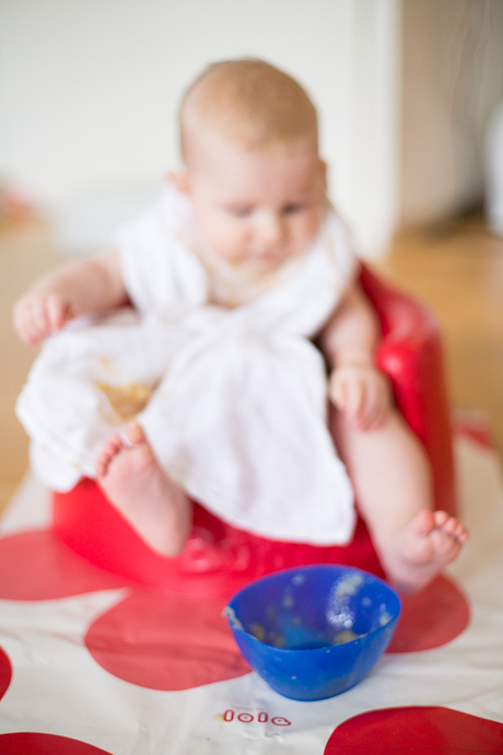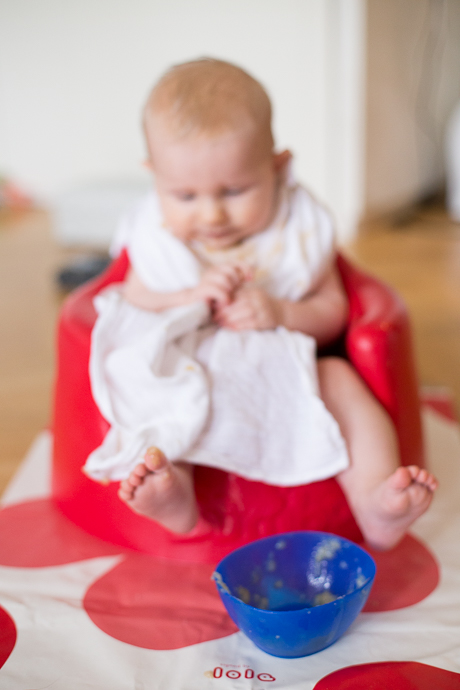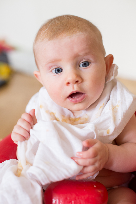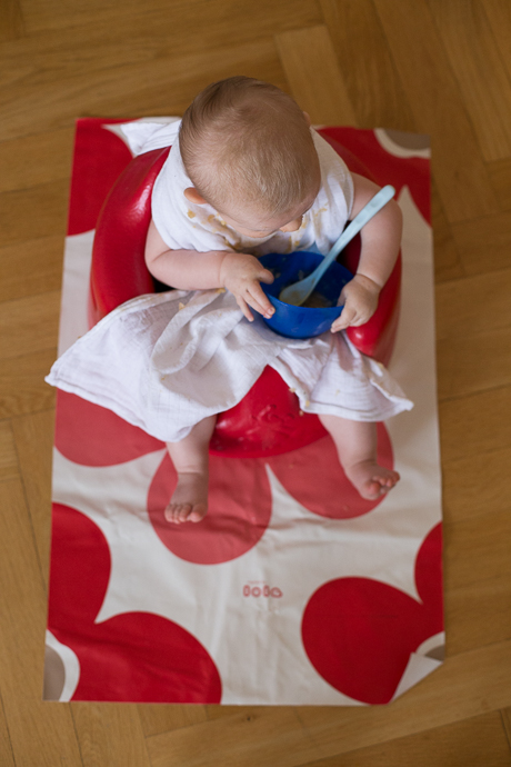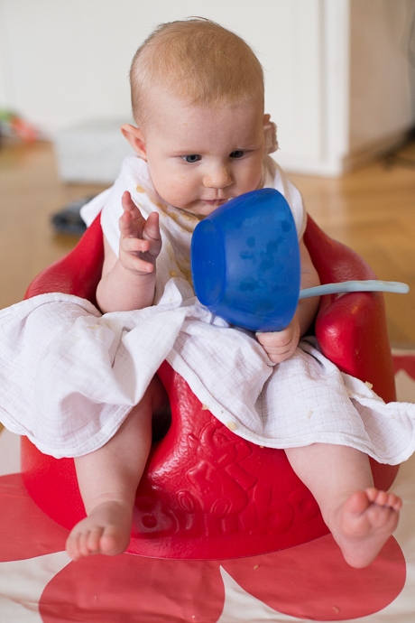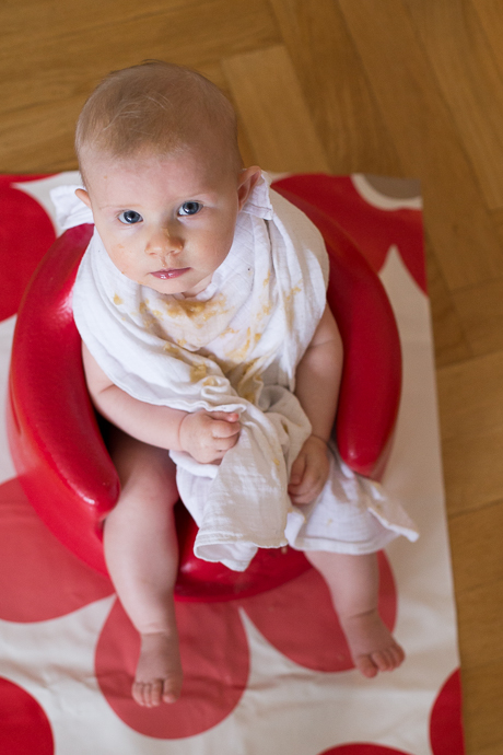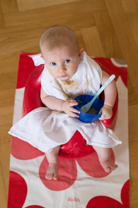 Emma isst seit ca. 3 Wochen. Oder sagen wir, sie probiert sich durch verschiedene Dinge und isst manchmal mehr, mal weniger. An den Löffel hat sie sich schon gut gewöhnt und nimmt ihn auch mal ganz gerne in die Hand (wie man sieht). Da uns ein Kinderstuhl fehlt (momentan), haben wir den Bumbo-Sitz zum Essen verwendet (roter Gummi“sessel“ auf den Bildern). Teilweise sitzt sie auch auf meinem Schoss. Auf dem Bildern sieht man die Klamotten-freundliche Version – nur in der Windel im Bumbo, im Hintergrund steht der „Puster“, der warme Luft auf sie bläst (nein, keine Sorge, Oma Karin, das Kind friert nicht… :-)!).