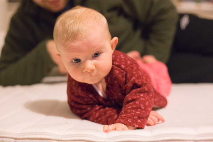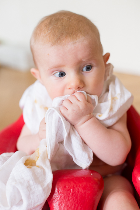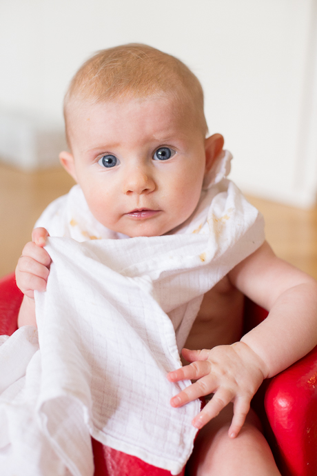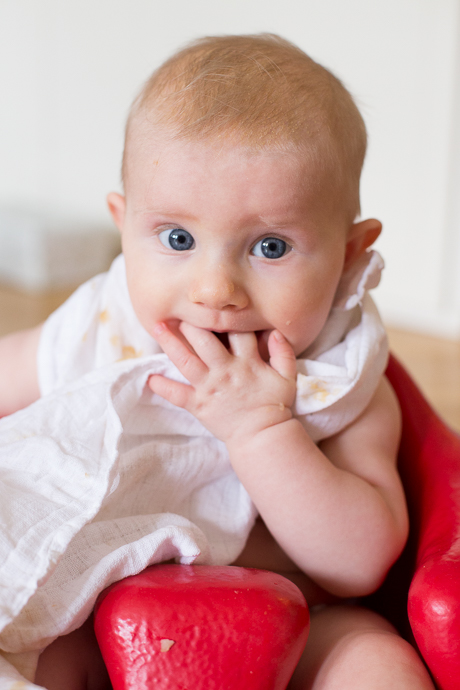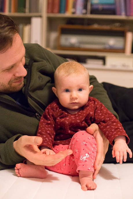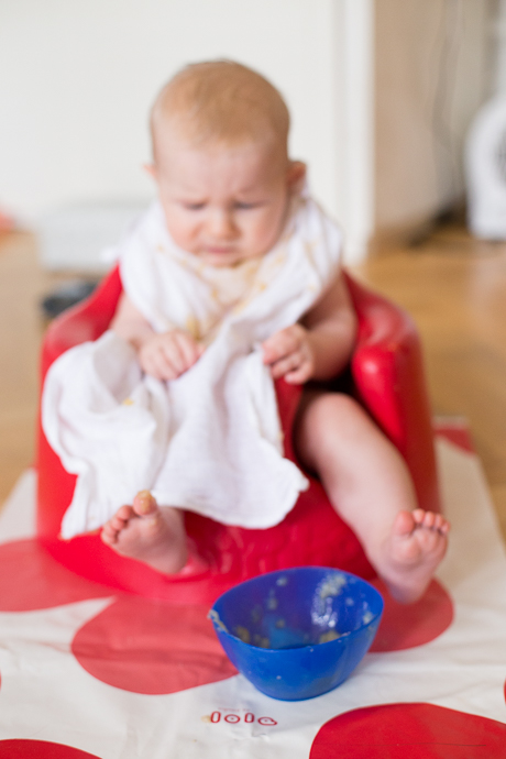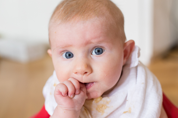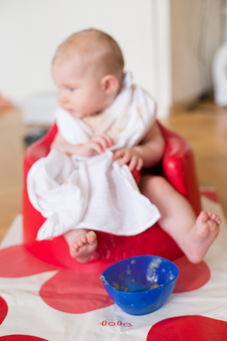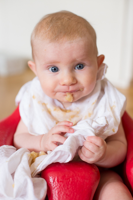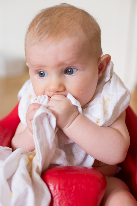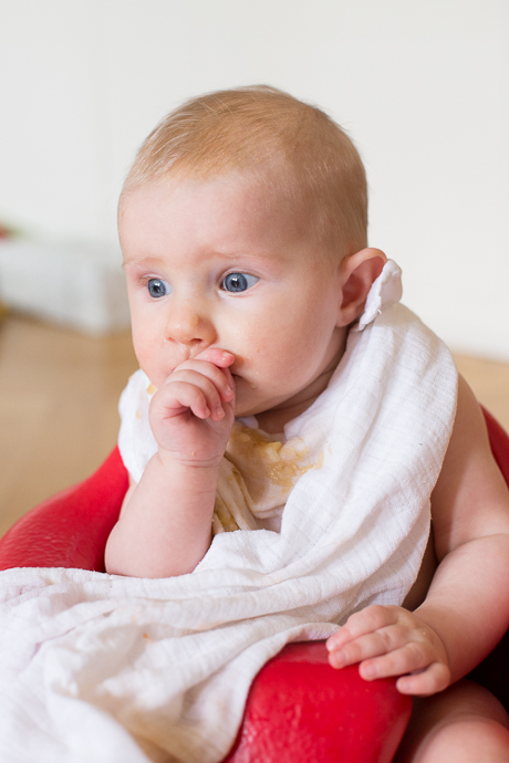 Emma isst seit ca. 3 Wochen. Oder sagen wir, sie probiert sich durch verschiedene Dinge und isst manchmal mehr, mal weniger. An den Löffel hat sie sich schon gut gewöhnt und nimmt ihn auch mal ganz gerne in die Hand (wie man sieht). Da uns ein Kinderstuhl fehlt (momentan), haben wir den Bumbo-Sitz zum Essen verwendet (roter Gummi“sessel“ auf den Bildern). Teilweise sitzt sie auch auf meinem Schoss. Auf dem Bildern sieht man die Klamotten-freundliche Version – nur in der Windel im Bumbo, im Hintergrund steht der „Puster“, der warme Luft auf sie bläst (nein, keine Sorge, Oma Karin, das Kind friert nicht… :-)!).