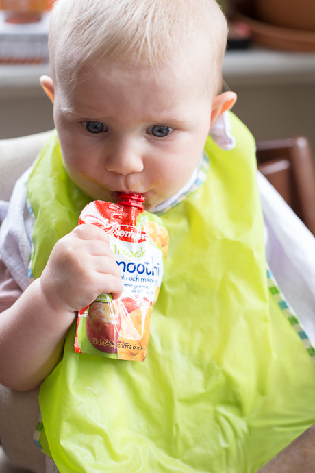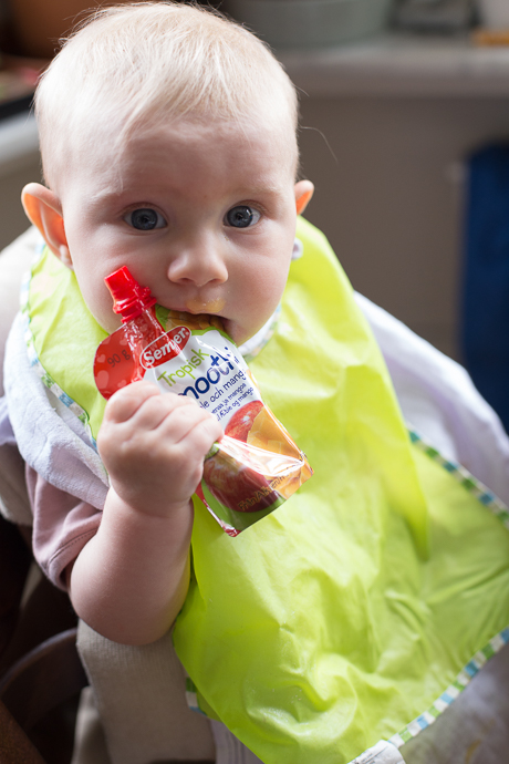 In Sachen Brei? Verweigerung von Gemüsebrei wird aufrecht erhalten. Griesbrei und Haferbrei sind genehmigt. Heute wurde sehr vergnügt ein Mango-Bananen-Brei vom Löffel gegessen. An der Brotrinde kauen? Immer. Ansonsten smoothies aus der fertigen Tüte schlürfen, das ist angesagt. Wir planen den Erwerb von wiederverwendbaren Tüten, die man selbst befüllen und einfrieren kann. Nach einmal ausprobieren hatte die gute Dame den Dreh raus mit dem Tütenschlürfen (siehe Foto).