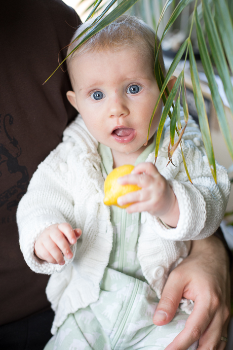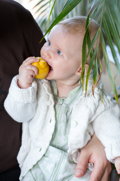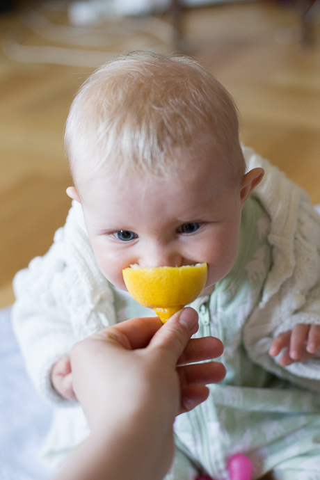 Heute hat sie nach dem Essen eine Bio-Zitrone probiert. Papa hat sie aus Quatsch mal lecken lassen an einer Hälfte. Sehr missmutiges Gesicht. Aber dann wollte sie die Zitrone glatt nicht mehr loslassen und hat sie ständig in der Mangel gehabt! Anscheinend hat ihr die Sache doch sehr wohl gemundet (siehe Foto)!