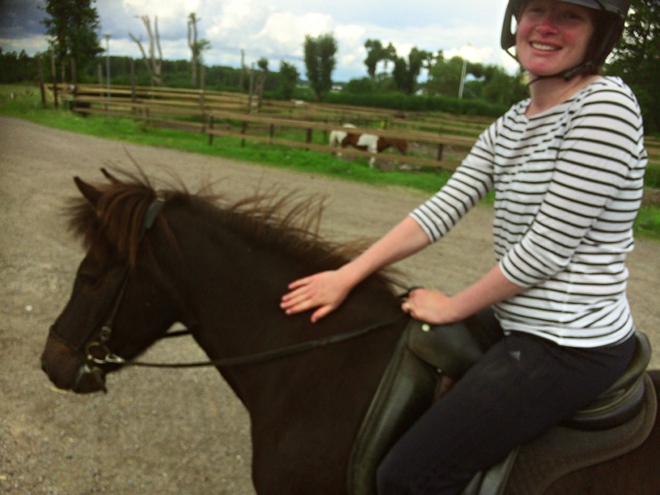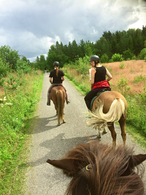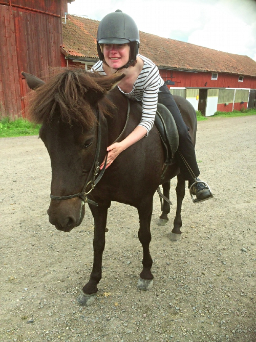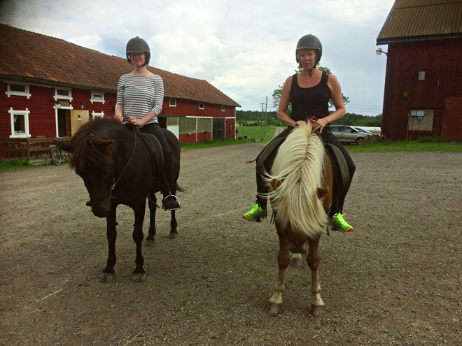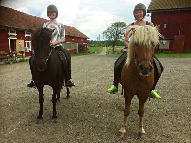 Gestern war ich mit meiner Freundin Susanna auf einem Reiterhof und dort haben wir einen (wohlverdienten) Ausspanntag gehabt. 2 Stunden Ausritt ins Gelände, Mittagessen, Sauna und Whirlpool unter freiem Himmel. Es war grandios! Nicht nur, dass es toll war, auf einem Islandpferd zu reiten und das Tölten auszuprobieren (was wirklich bequemer ist als der Trab), sondern auch neben sonnenbeschienenen Getreidefeldern (teilweise mit dramatischem Licht und Wolkenspektakel) und durch den Wald zu reiten, vorbei an Blaubeeren, Himbeeren und allerlei Pilzen, war wirklich toll! Die schwedische „Pampa“ hier ist wirklich sehr schön und lädt zu solchen Abenteuern ein.