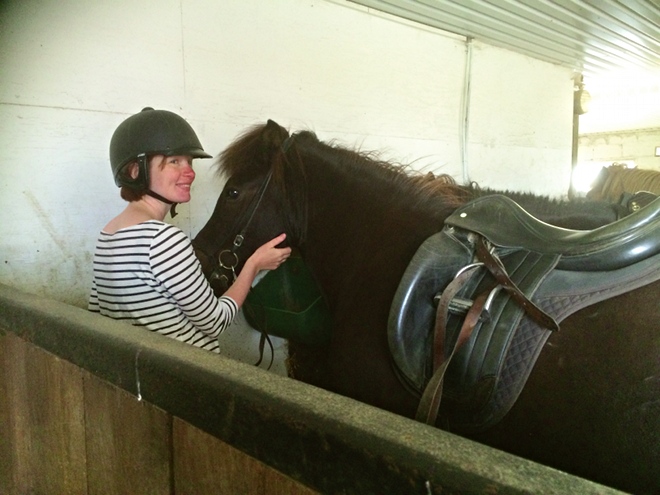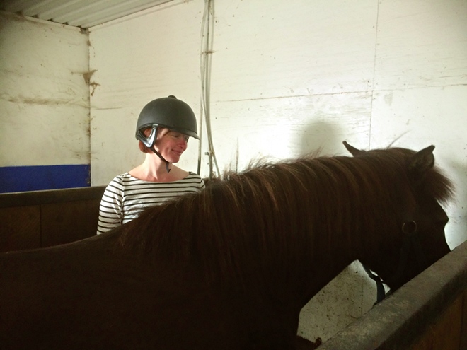 Wir hatten sogar das Glueck, dass Susanna und ich alleine mit der Reitlehrerin unterwegs waren, nicht in einer grösseren Gruppe. Und meine Pferdedame namens Nota war sehr angenehm, stand still beim Aufsteigen, machte keinerlei Papperlapp, ging souverän durch Gestruepp, Steinsortimente, Äste auf dem Boden und reagierte wirklich prompt auf jedes Kommando. Sie war offensichtlich erfreut, sich zu bewegen und musste nicht grossartig zum Tölten ueberredet werden. Sehr angenehm. Alles klappte wirklich gut. Gott sei Dank sind Isländer nicht so gross, dass macht sie sehr sympatisch, besonders fuer Leute wie mich, die keine grossen Helden beim Aufsteigen sind. Und dass sie statt 3 Gängen 5 zur Auswahl haben, macht sie nicht gerade weniger interessant. Nun habe ich also die „Islandpferd-Meise“.