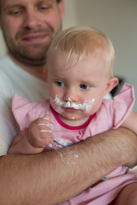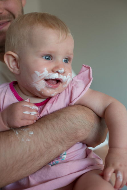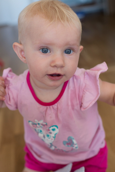 Sie will zunehmend selbst essen (und eine Sauerei veranstalten) und hat immer weniger Interesse an Brei. Den isst sie nur im Zusammenhang mit Obst, Kartoffeln, Gries oder Hafer. Sie liebt Pasta (ohne alles) und findet auch Couscous lecker. Reis steht auch hoch im Kurs. Mozzarella muss man ihr nicht zweimal sagen, da ist er schon weg. Mit dem Fisch gab es bislang noch keinen so grossen Erfolg. Noch immer macht sie laute Geräusche beim Essen und verheimlicht ihren Unwillen (oder ihre Freude) in keinster Weise.