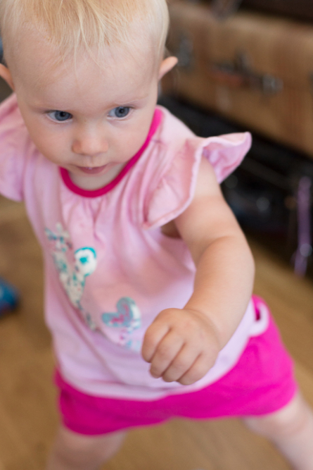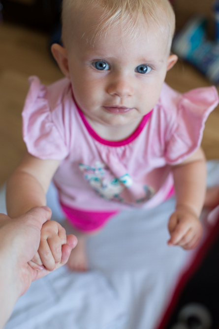 Emma hat ihren Stand weiterentwickelt und ist die ersten Schritte allein gegangen. Immer nur einen, aber dies aus dem Stand und in den Stand (ohne Umfallen etc.). Ich glaube sie könnte eigentlich mehr als das, aber sie geht lieber auf Nummer sicher und krabbelt ans Ziel. András meint auch, dass sie wahrscheinlich mehr könnte, denn er hat sie im Drehen einen Schritt machen sehen. Und das ist ja nochmal etwas kniffliger.