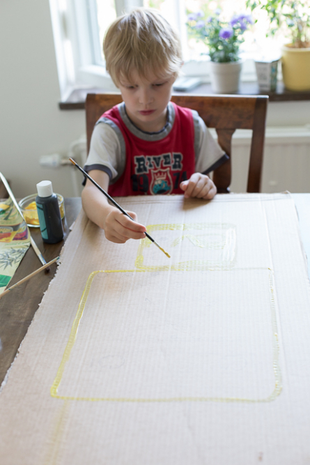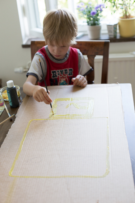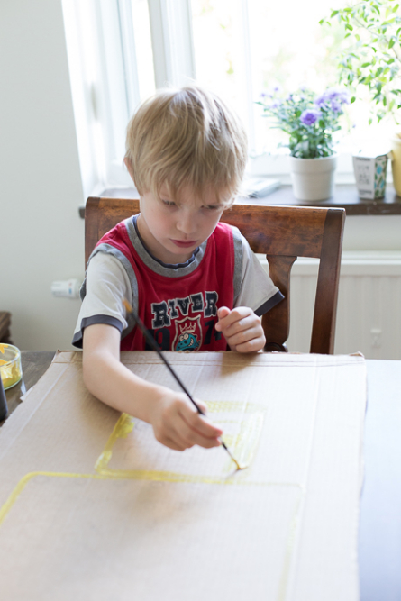 Wann immer sich die Möglichkeit ergibt (und Albert und ich Lust haben), bereiten wir die Weltraum-Geburtstagsparty vor. Hier sieht man Albert beim Malen des Roboterbildes. Ich habe die Vorlage gemacht und die Konturen gemalt und er hat ausgemalt. Das hat er echt gut gemacht!