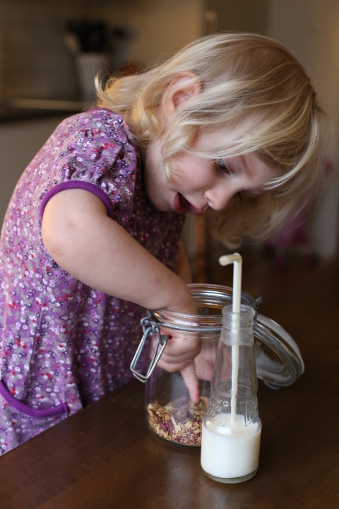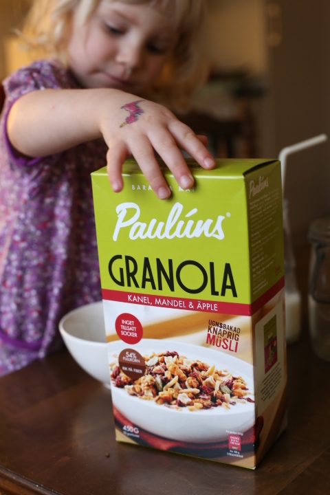 Eine Entdeckung. Und was für eine. Ein Knuspermüsli, das so gut schmeckt, dass ALLE in der Familie Fan geworden sind. Und das kommt – besonders bei Papa – nicht so oft vor. Ohne Zuckerzusatz, voll mit gesunden Zutaten, knusprig, knusprig, superknusprig und angenehm fruchtig. Die Trockenfruchtstückchen schmecken wirklich gut und man möchte einfach nicht mehr aufhören. Wie man bei den Bildern sieht, Emma findet das auch. Leider hört man ihr kontinuierliches „Mhmm, mhmmm, mhmmm“ nicht. Wenn sie so klingt, dann schmeckt es ihr wirklich und das Lob nimmt kein Ende. Das Glas wurde gelehrt und zum Glück gab es noch eine neue Packung im Schrank…