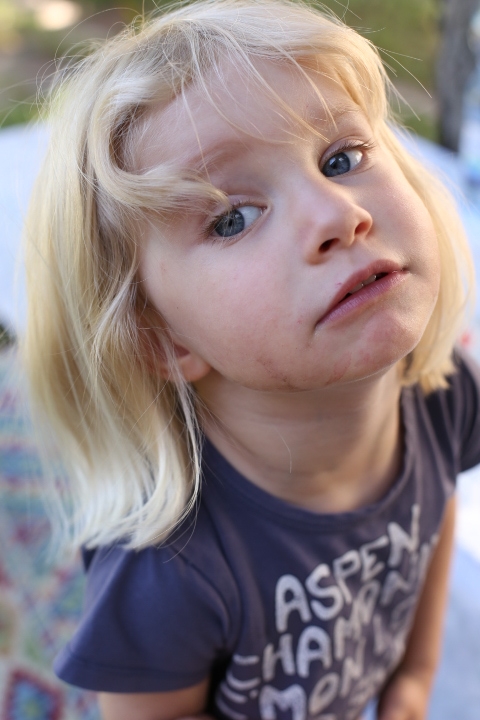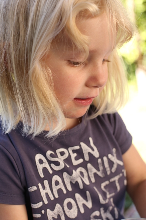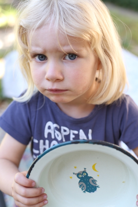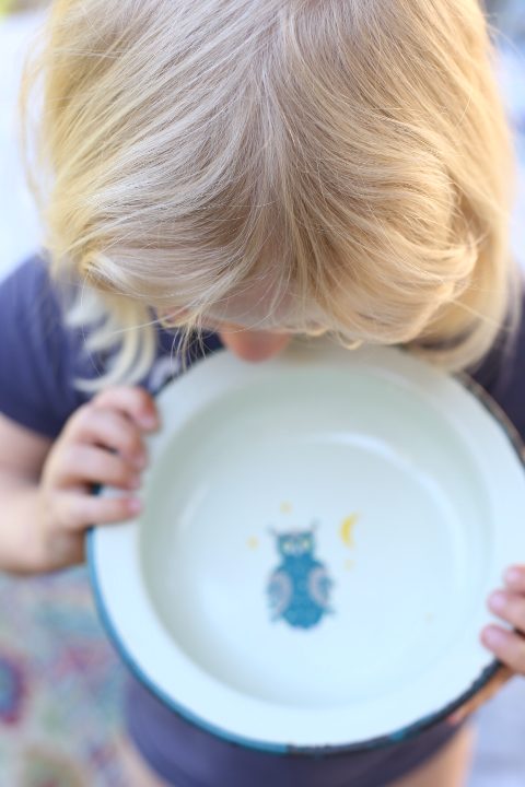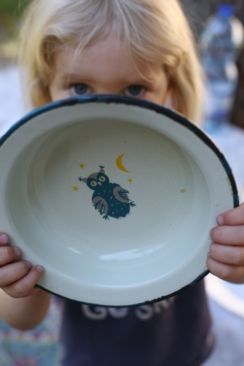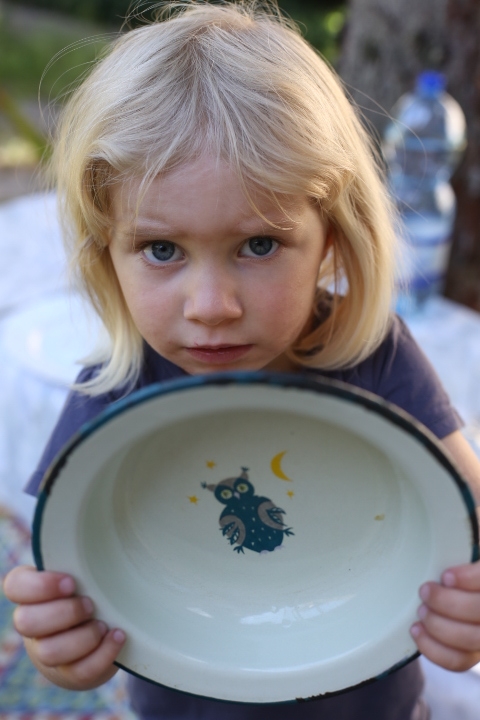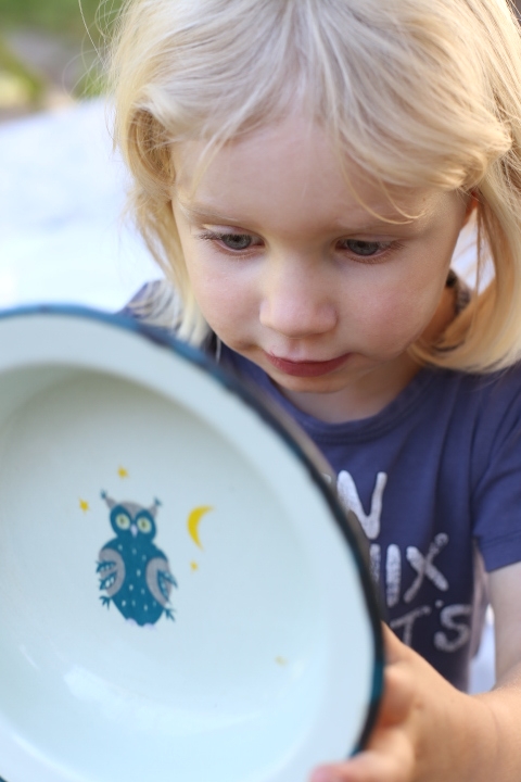 Bei Oma gibt es sehr spezifische Teller. Die entstammen noch der Zeit, zu der Papa noch ein paar Zentimeter kleiner war. Der momentane Favorit von Emma ist der Eulenteller. Der muss am besten zu allen Mahlzeiten verfügbar sein. Eigentlich wollte ich heute Emmas Frisur fotografieren mit den glatt“gebügelten“ Locken, die zum Geradeschneiden der Frisur nötig war, wie von der netten Friseurin vorgeschlagen wurde. Aber Emma fand das nicht wirklich dokumtentationswürdig, den Eulenteller aber schon. Ich habe sie zumindest etwas austricksen können.