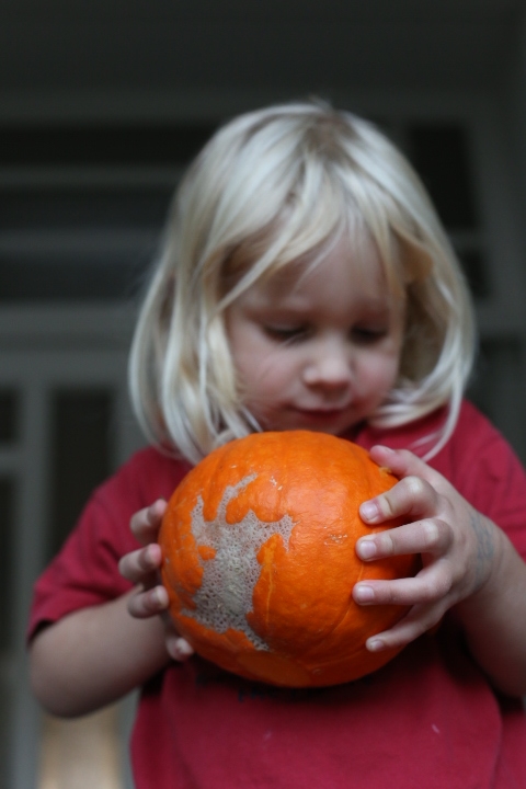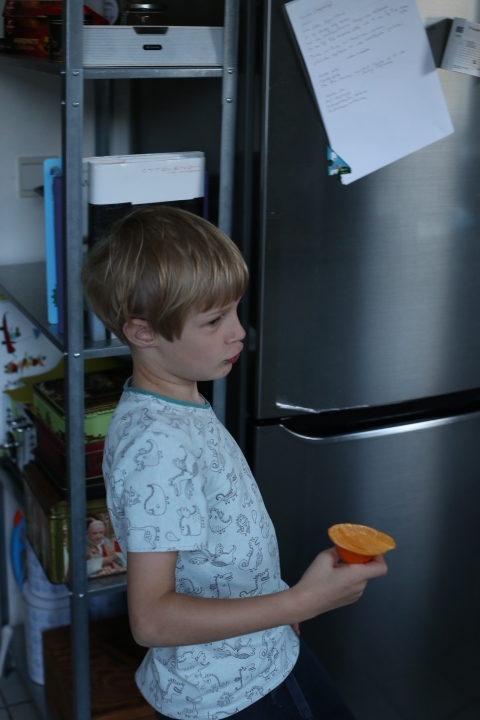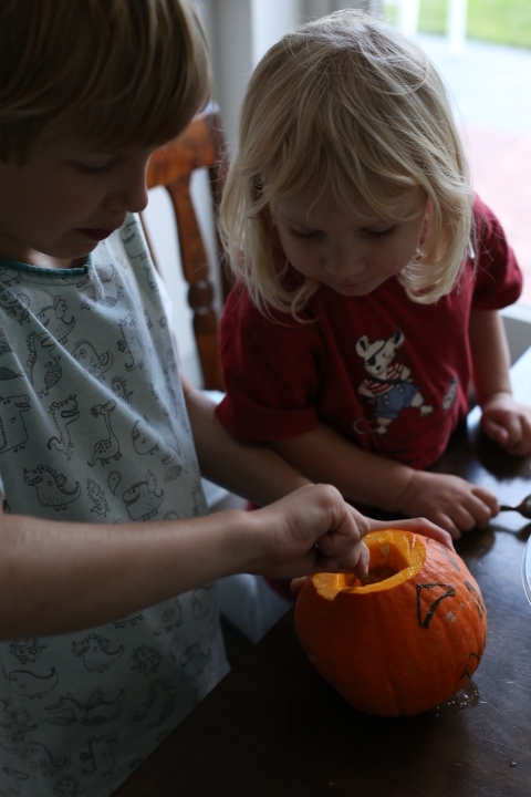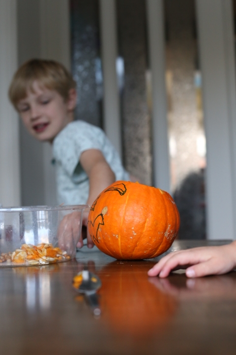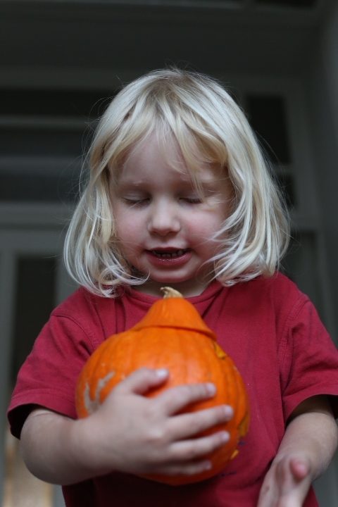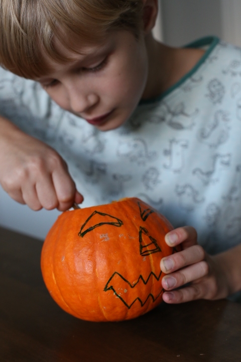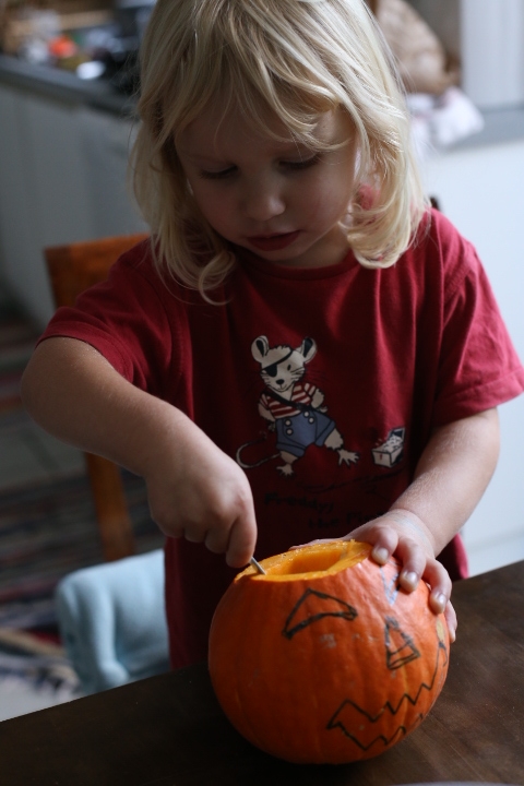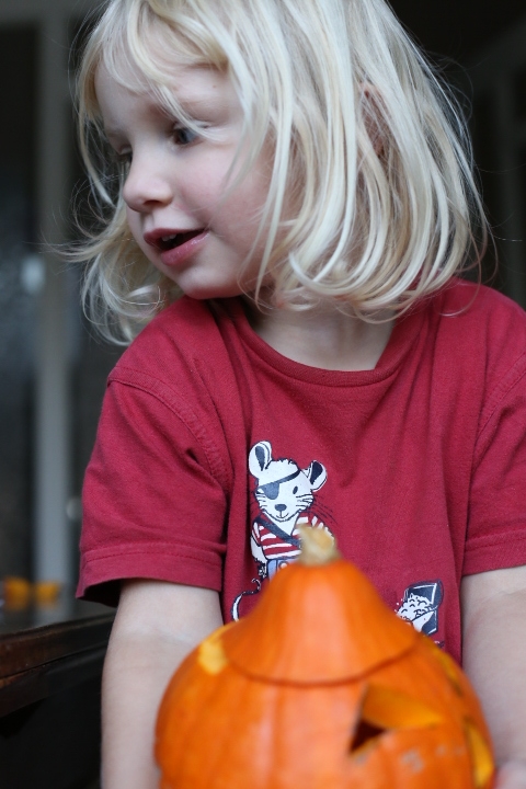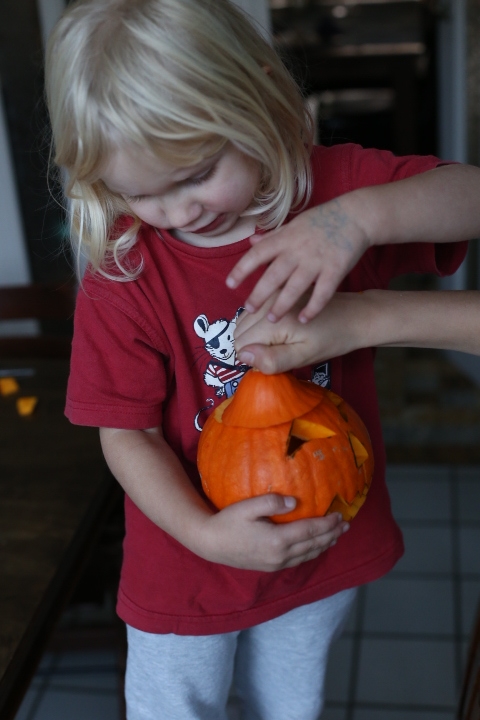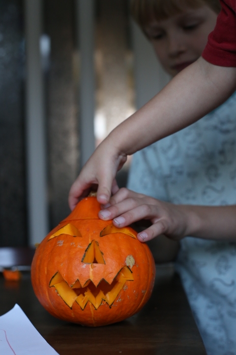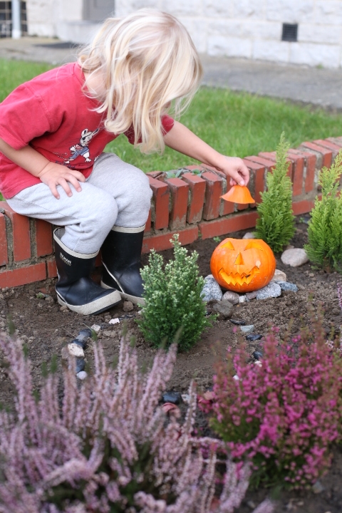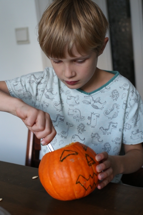 Wer einen Opa mit grünem Daumen hat, hat Glück. So wie Albert und Emma. 3 sehr schöne Kürbisse wurden uns im August geliefert und Nr 2 und 3 fielen in den letzten Tagen dem Küchenmesser zum Opfer. Nr 2 endete in einer leckern Kürbissuppe. Nr 3, der kleinste von allen, steht jetzt im Vorgarten und leuchtete heute Abend eventuellen Passanten heim. Albert war Feuer und Flamme. Das erste Mal, daß wir einen Kürbis bearbeiten im Halloween-Stil. In der Schule wird Halloween nicht gefeiert und auch zuhause erfreut sich das Fest bei den Erwachsenen keiner besonders großen Beliebtheit, aber so ein bißchen mit den Kindern mitziehen…warum nicht. Haus Nr 27 jedenfalls liegt seite heute voll im Trend.