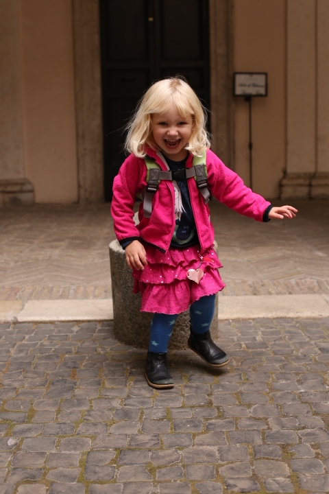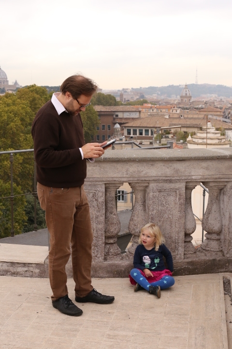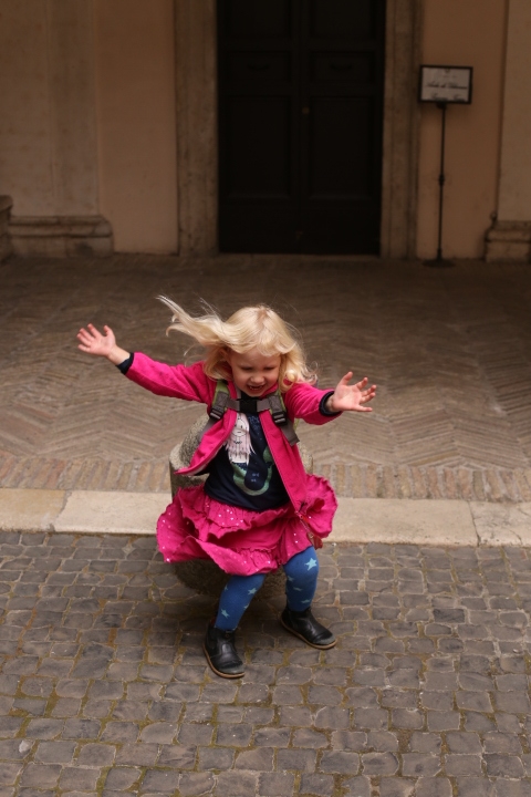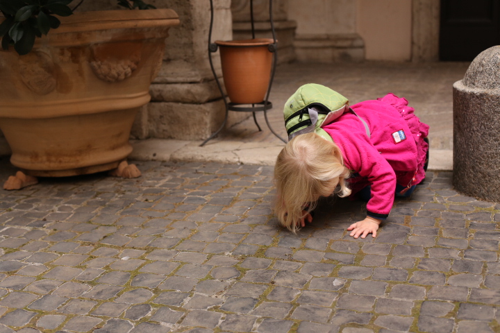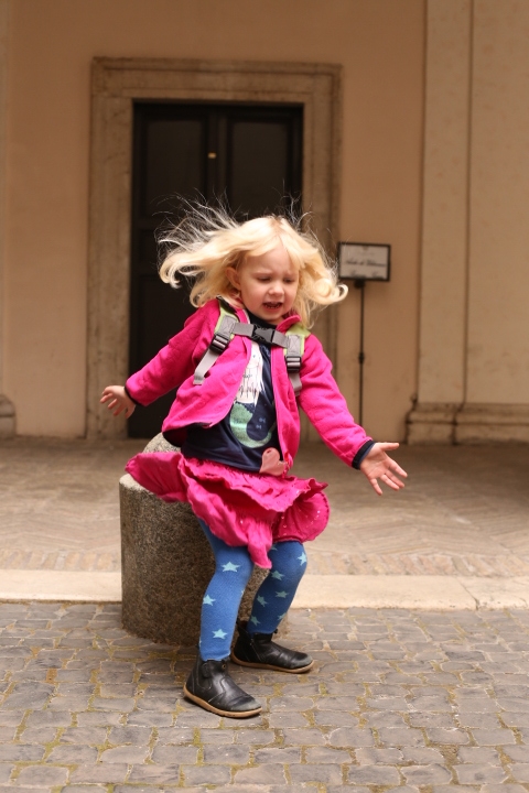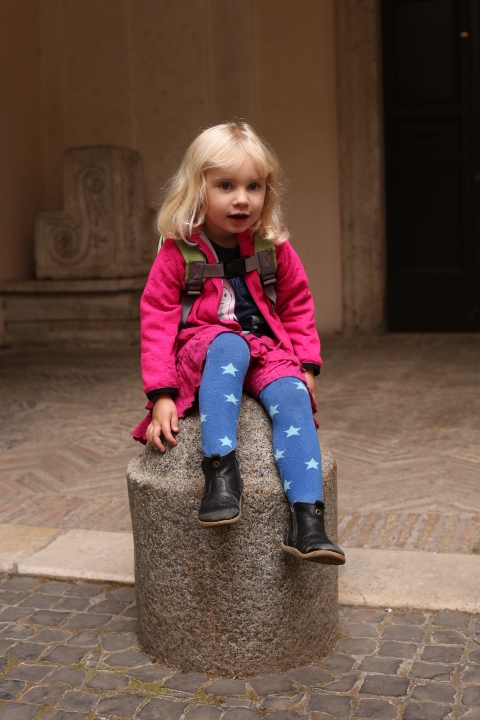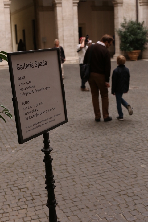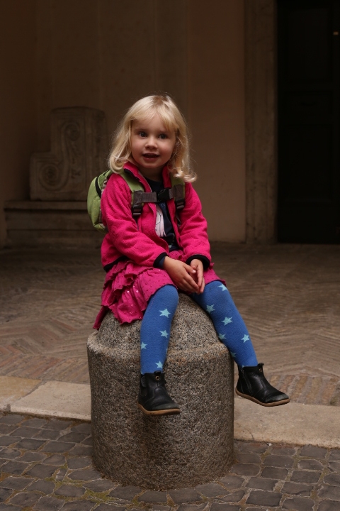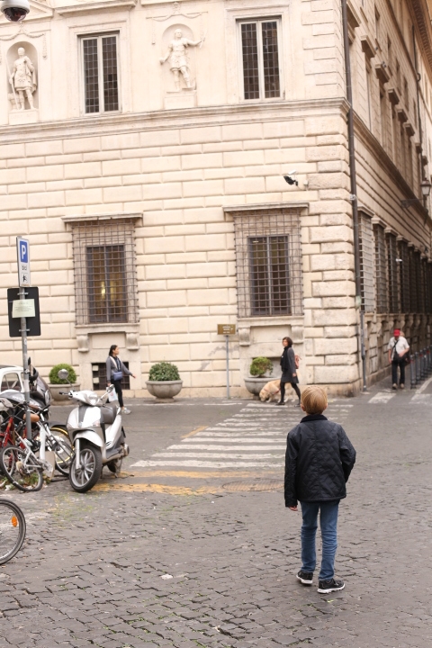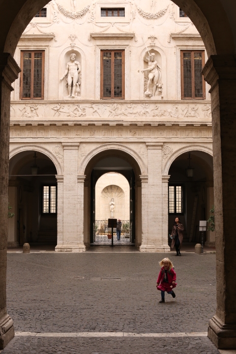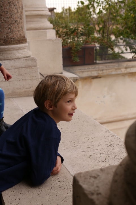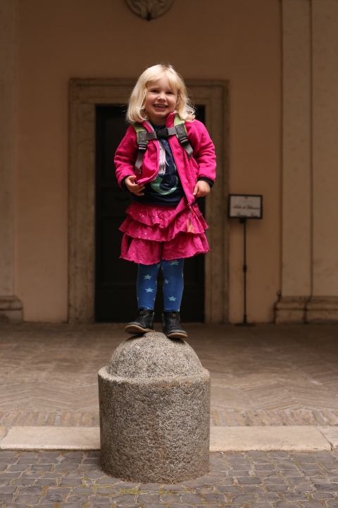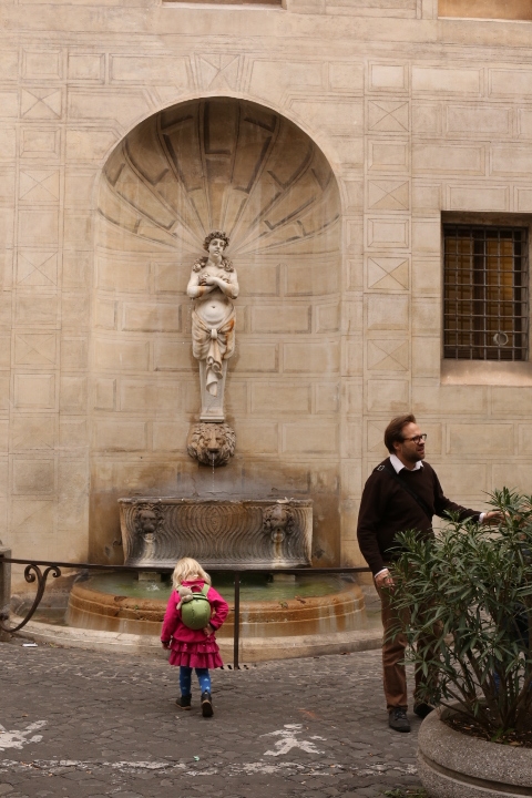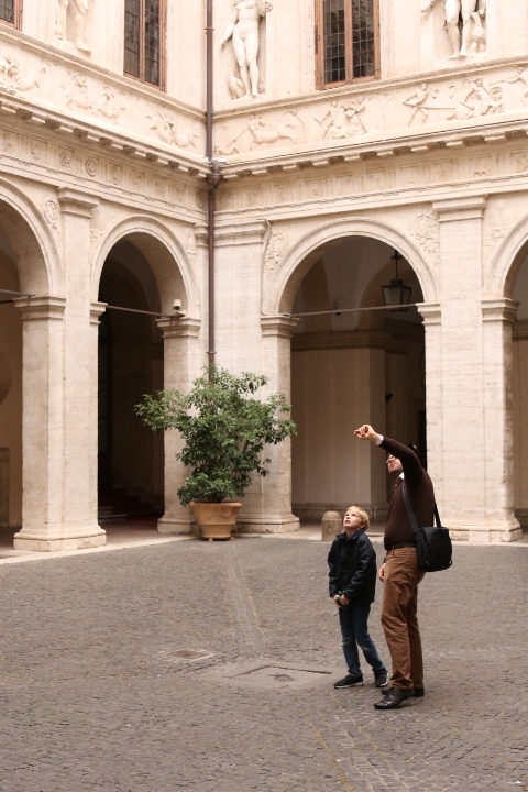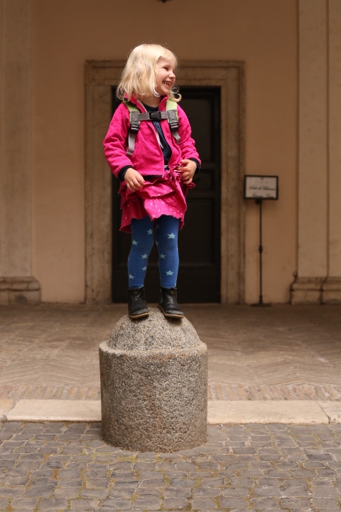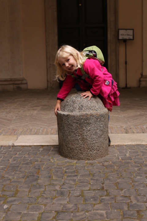 Nach dem (späten) Frühstück in der Bar (Papa und Albert) und in der Unterkunft (Mama und Emma, denen der Kaffee bzw. die Cornetti aus der Bar mitgebracht wurden) ging es um die Ecke zum Palazzo Spada. Papa und Albert widmeten sich den Fakten, Emma und ich widmeten uns Experimenten mit der Schwerkraft. Dann ging es weiter zum Piazza Farnese, wo die vielen Tauben am Brunnen bewundert wurden und das bewaffnete Personal vor der französischen Botschaft/ dem Palazzo Farnese.