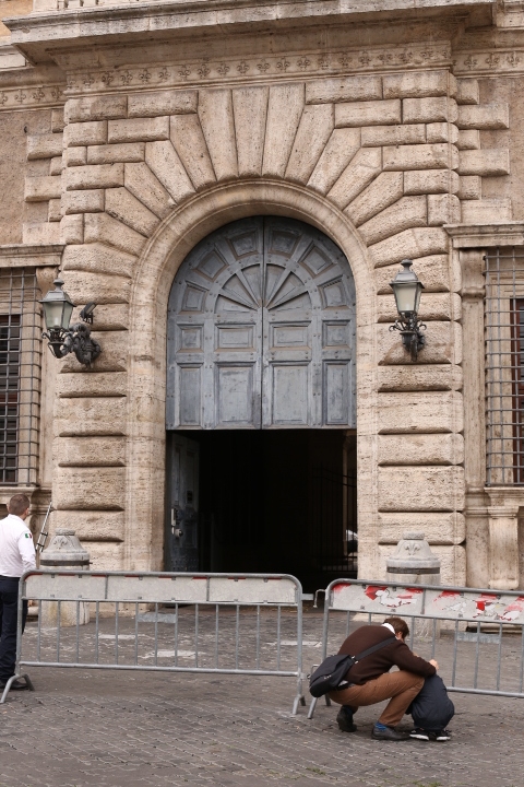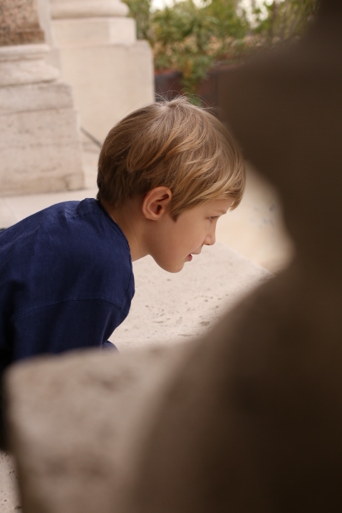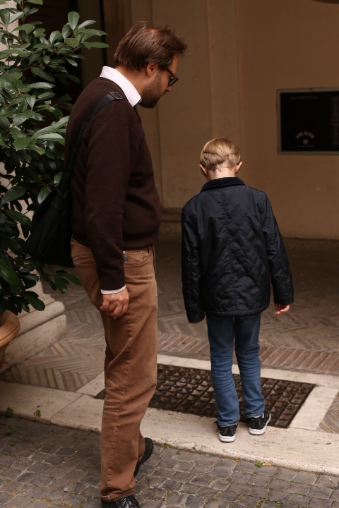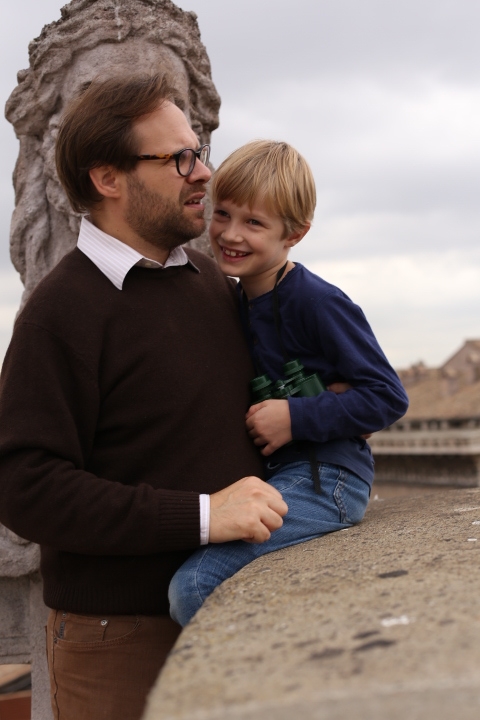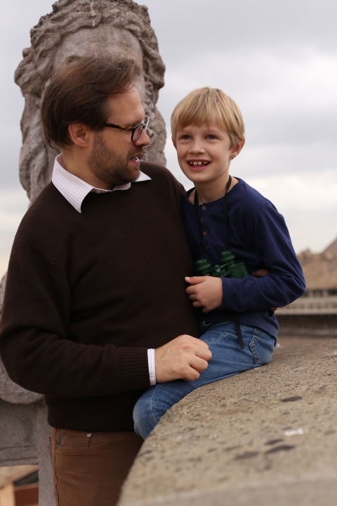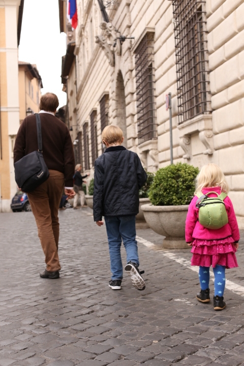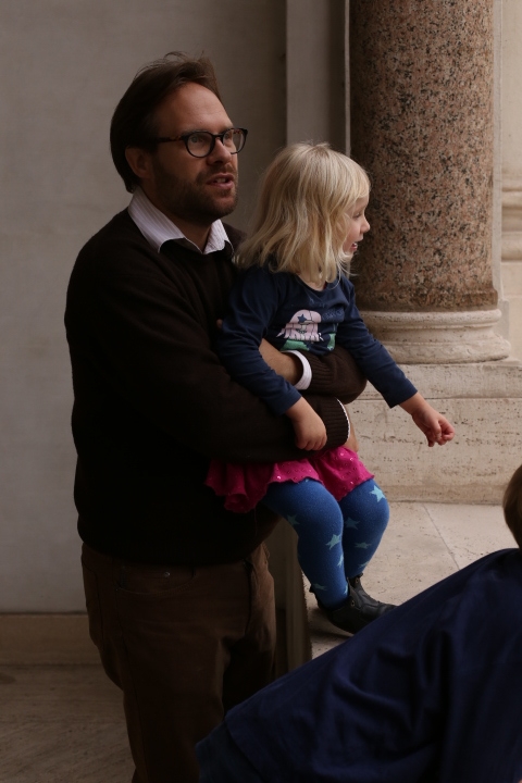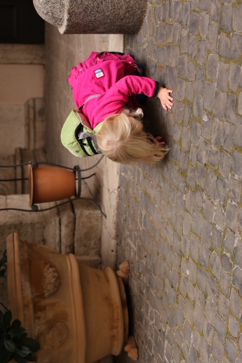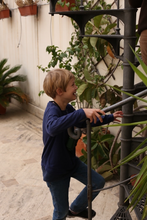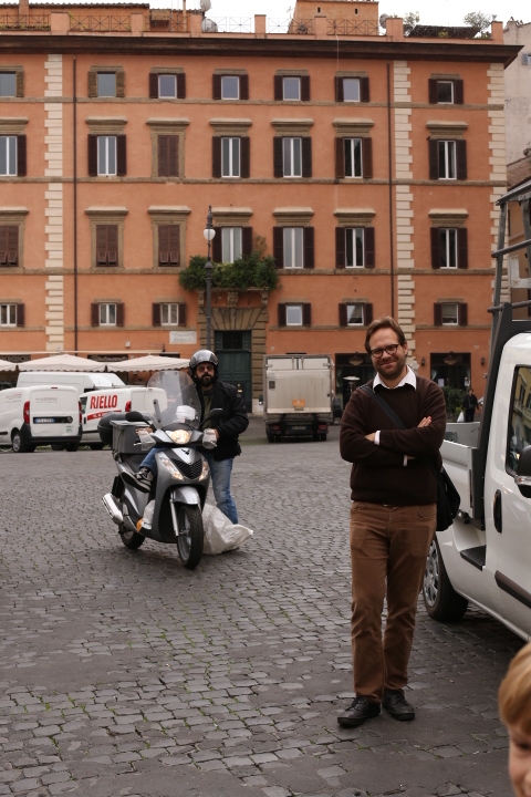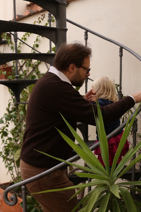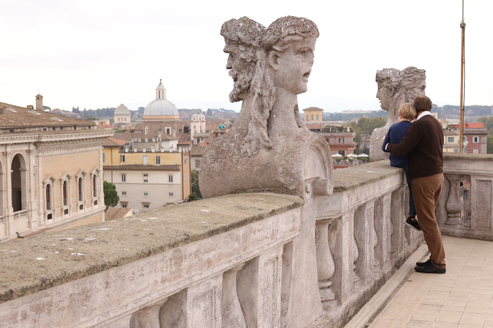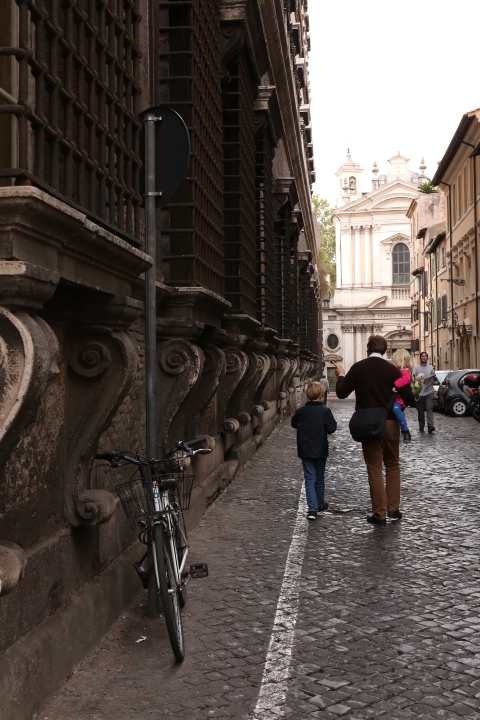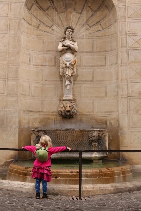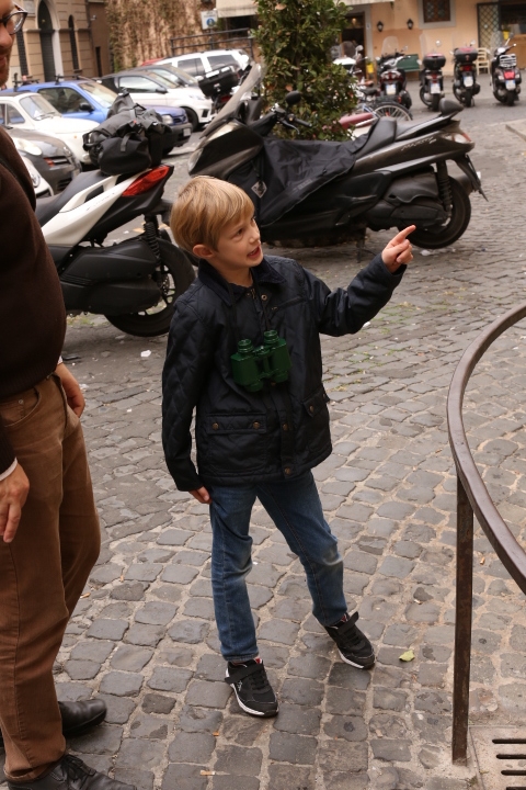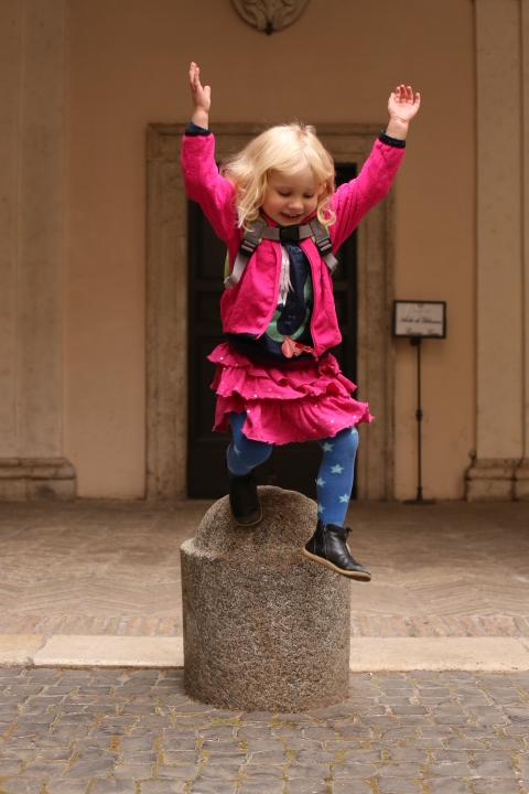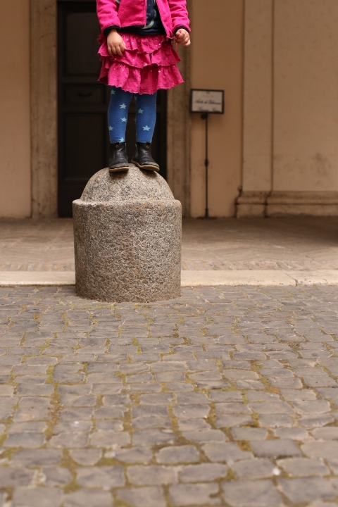 Nach dem (späten) Frühstück in der Bar (Papa und Albert) und in der Unterkunft (Mama und Emma, denen der Kaffee bzw. die Cornetti aus der Bar mitgebracht wurden) ging es um die Ecke zum Palazzo Spada. Papa und Albert widmeten sich den Fakten, Emma und ich widmeten uns Experimenten mit der Schwerkraft. Dann ging es weiter zum Piazza Farnese, wo die vielen Tauben am Brunnen bewundert wurden und das bewaffnete Personal vor der französischen Botschaft/ dem Palazzo Farnese.