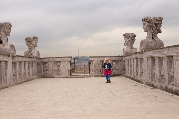 Die ungarische Akademie. Der Ort, an dem Papa die letzten Wochen gelebt hat. Das wollten wir sehen! Besonders Highlight (im warsten Sinne des Wortes) die Loggia und die Dachterasse. Einziges Problem (vor allem für mich): Die Wendeltreppe, die sich außen am Haus in die Höhe windet. Aber weil die Aussicht so großartig war (laut András) wagte ich dennoch den Weg nach oben. Und bereute es keineswegs. Die Aussicht war wunderbar. Und als ich oben ankam, gab es Applaus. Höhenangst – Mama, 0:1. Auf dem Weg nach Hause wurden Pizza und Focaccia eingekauft und mit viel Beifall auf dem Balkon verspeist – Mamaammmm!