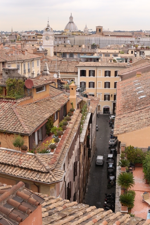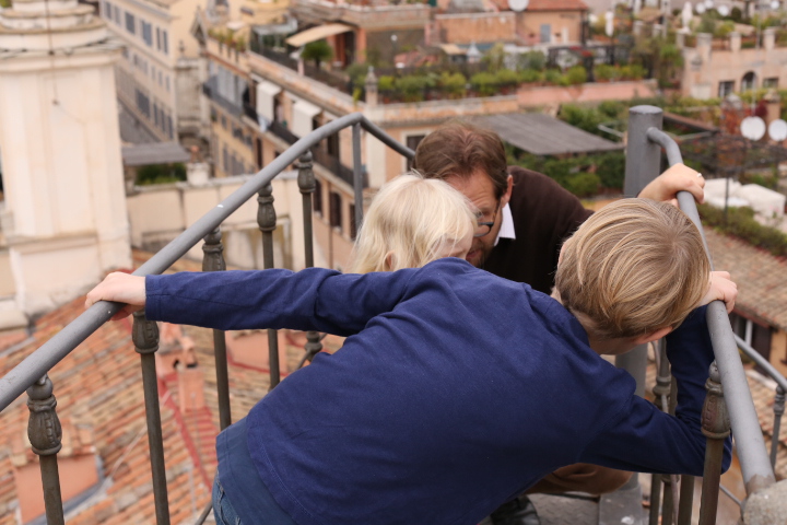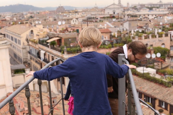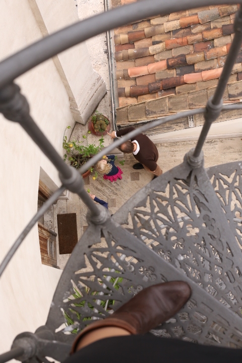 Die ungarische Akademie. Der Ort, an dem Papa die letzten Wochen gelebt hat. Das wollten wir sehen! Besonders Highlight (im warsten Sinne des Wortes) die Loggia und die Dachterasse. Einziges Problem (vor allem für mich): Die Wendeltreppe, die sich außen am Haus in die Höhe windet. Aber weil die Aussicht so großartig war (laut András) wagte ich dennoch den Weg nach oben. Und bereute es keineswegs. Die Aussicht war wunderbar. Und als ich oben ankam, gab es Applaus. Höhenangst – Mama, 0:1. Auf dem Weg nach Hause wurden Pizza und Focaccia eingekauft und mit viel Beifall auf dem Balkon verspeist – Mamaammmm!
