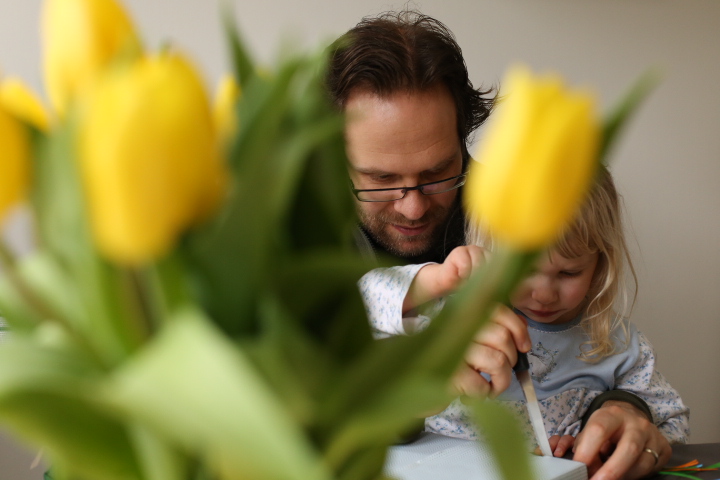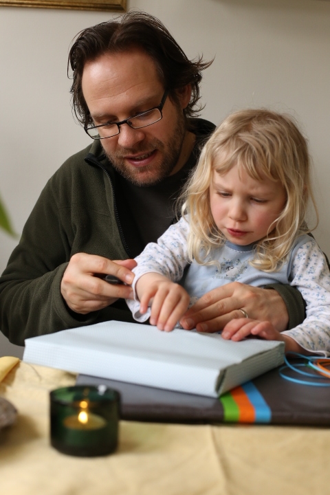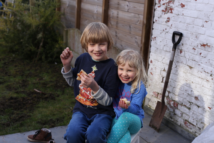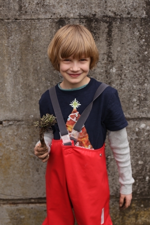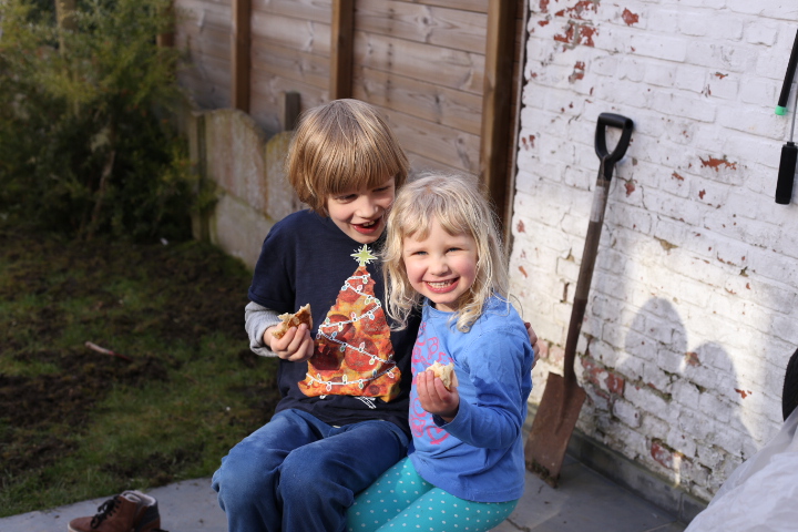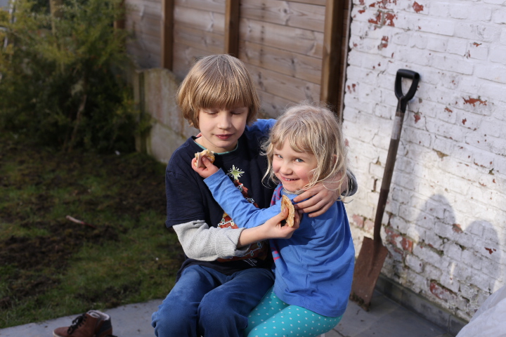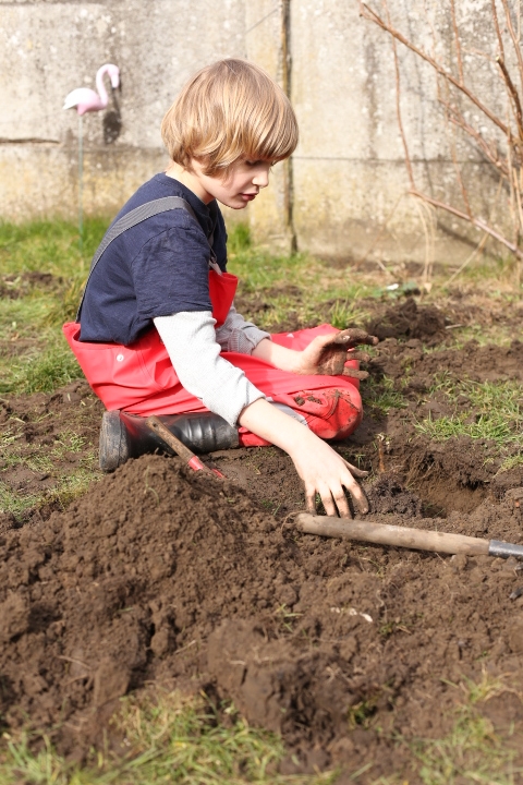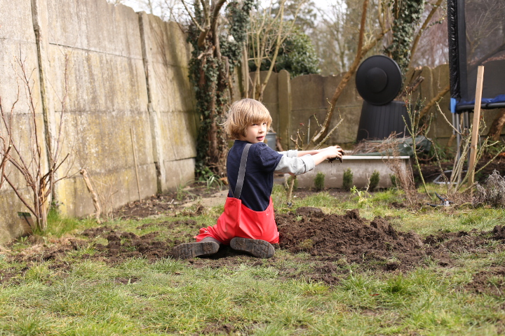 Unser Gartenboden ist eine interessante Mischung aus Löwenzahn, Gras, Moos und Löchern. An letzterem wollten wir etwas ändern indem wir Grassamen zur Reperatur von Lücken im Rasen gekauft haben. Nun ja. Irgendwie ist aus dem Lückenfüllen eine fröhliche Buddelei geworden, bei der ich entdeckte, dass man sehr gut Frustrationen zum Thema Arbeit in den Boden stecken kann und Albert sich ganz unerwartet und gebannt der Faszination Erde widmete. So war das letzten Sonntag. Neben einer kleinen Geburststagskaffeerunde für Papa wurde der Garten heftigst durchmaulwurft. Zwar war ich durchaus bemüht den Boden hinterher zu begradigen aber bei einem Blick nach draussen habe ich das Gefühl, dass daraus eher ein Picasso-gerade geworden ist. Ähnlich wie bei allen Brotscheiben, die ich schneide. Auf jeden Fall wachsen bereits kleine feine Grashalme und ich hoffe, dass sie sich vom heutigen Schneefall nicht vom Weiterwachsen abhalten werden lassen.