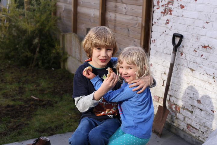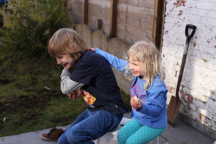 Letzten Sonntag, Papas Geburtstag. Gartenaktion. Ein Flecken reflektiertes Licht, von Papa gesehen. Er schnappte sich die Kamera und schwupps, ein kleiner Geschwistermoment. Festgehalten für immer. Wie schön!