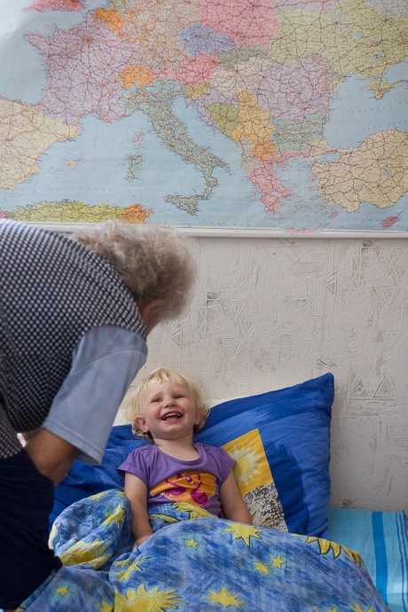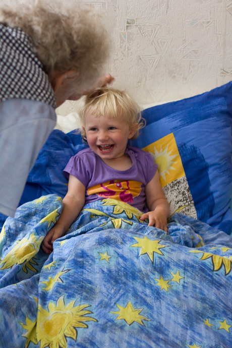 Emma nennt ihre Urgroßmutter „béka“. Uebersetzt ist das der kleine gruene Kamerad aus dem Wasser, der jungen unvorsichtigen Damen ab und zu goldene Kugeln aus dem Brunnen holt. Mit anderen Worten ein Frosch. Warum und wieso sie sich das so ausgedacht hat ist unklar aber sie ist fest davon ueberzeugt, dass dédimama eben béka heissen musst. Und sie ist ein grosser Fan von „béka“ – wie die Bilder eindeutig beweisen!