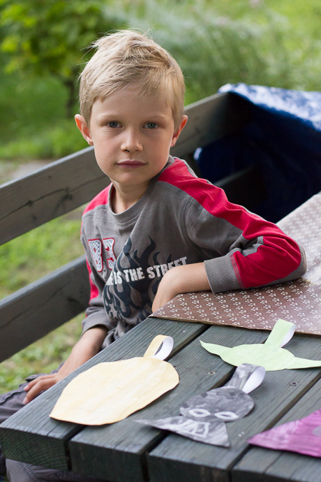 Als ich in der Bibliothek ein Bastelbuch fand in dem es von Figuren aus Star Wars nur so wimmelte, war klar, dass Albert dieses Buch unbedingt ansehen muss und es folglich ausgeliehen werden sollte. Das fröhliche Gesicht unseres Sohnes im letzten Eintrag klassifiziert diese Idee als astrein. Gleich musste Oma Bastelsachen suchen und es wurde fleissig gewerkelt!