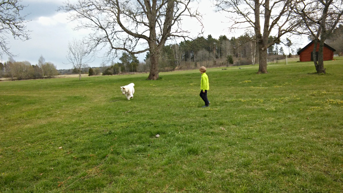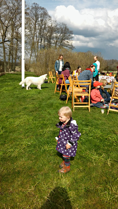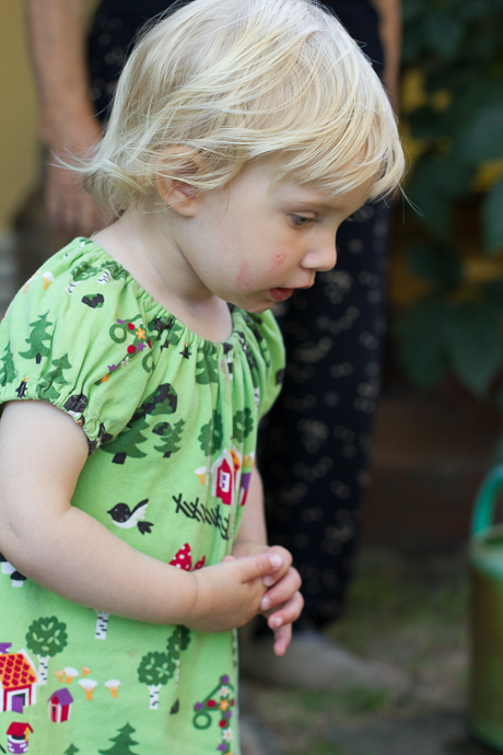 Sie kann schätzungsweise 15 bis 20 Worte in sowohl Ungarisch als auch Deutsch und kann auch Schwedisch schon ganz gut verstehen. Ihr momentaner Liebling ist der Hase (Hasi auf Deutsch und nyuszi auf Ungarisch), den sie „Wussi“ nennt. Es ist so süß, wenn sie durch die Wohnung rennt und „Wussi, wussi!“ ruft und auf ihr Kleid mit Hasenapplikation zeigt!