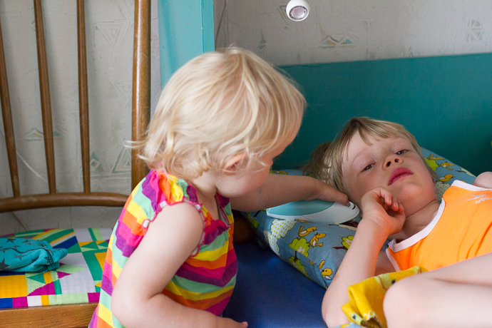 Albert war in Ungarn ein bisschen krank. Emma wollte gerne Krankenschwester sein und der Papa hat Albert durchgeknuddelt…