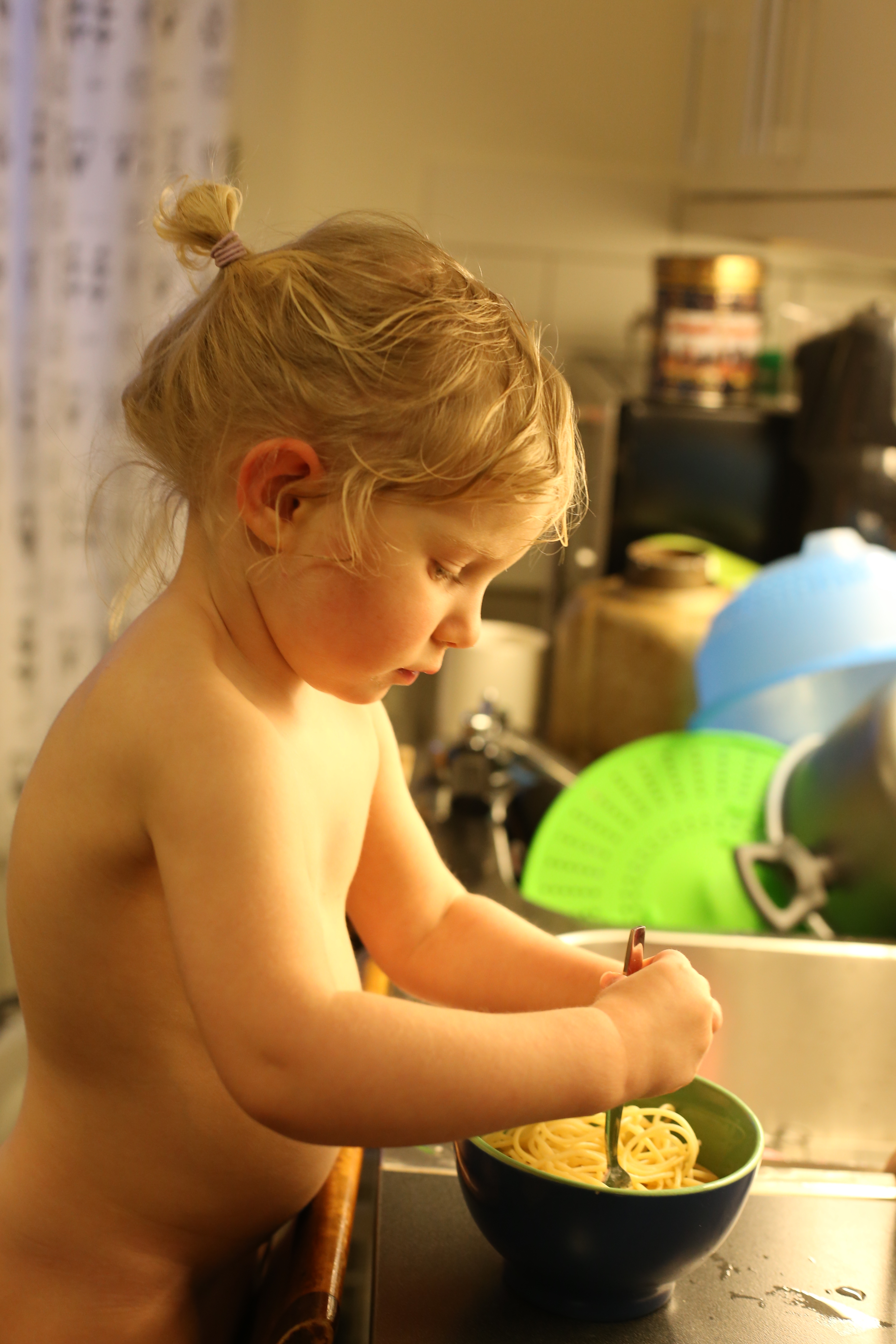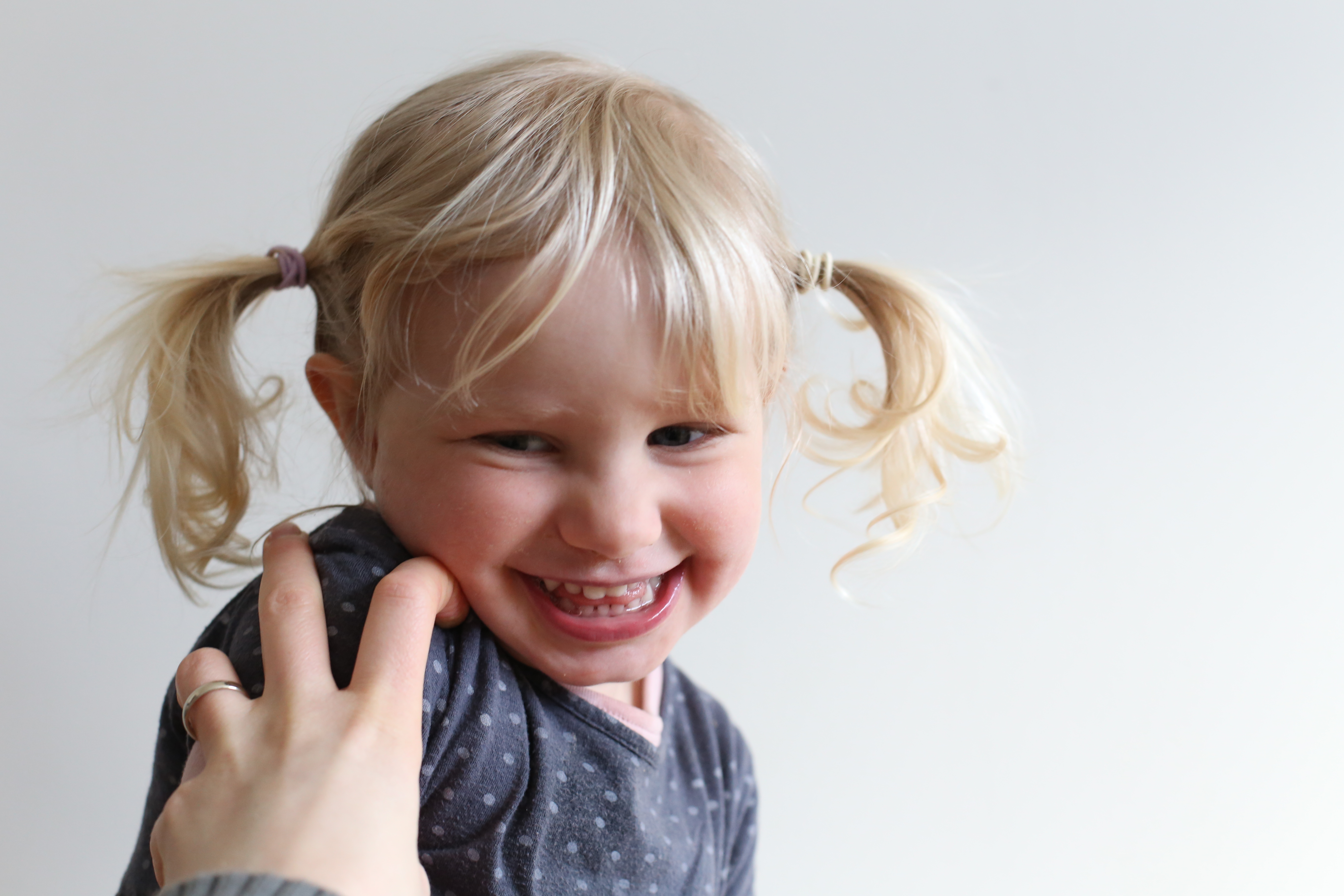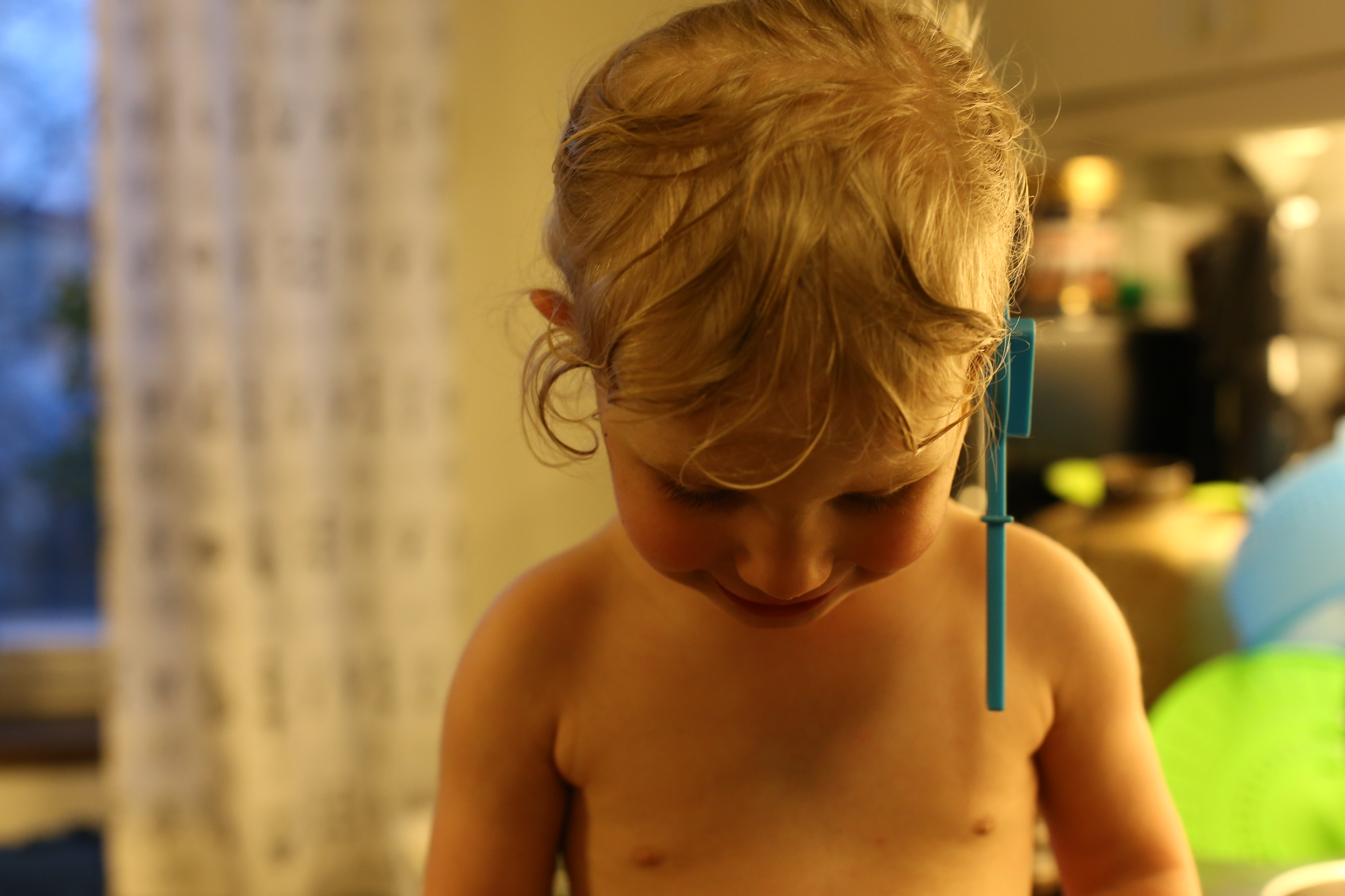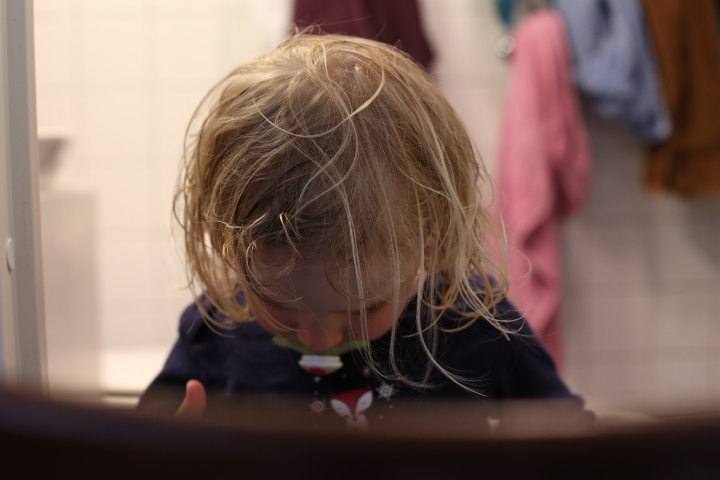 Leider ist Emma kein Fan von Haargummis und Zöpfen. Schade eigentlich, denn die stehen ihr ausgezeichnet. Hier wurde nur mal ganz schnell was in die Haare gewurschtelt, bevor sie die Geduld verlor. Leider ist es eine Tortur ihre feinen Haare zu kämmen, sie hat ständig Essen in den Haaren, will aber kein Haargummi. Von daher werden die Haare bald ein bisschen kuerzer werden muessen…