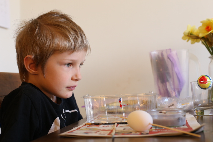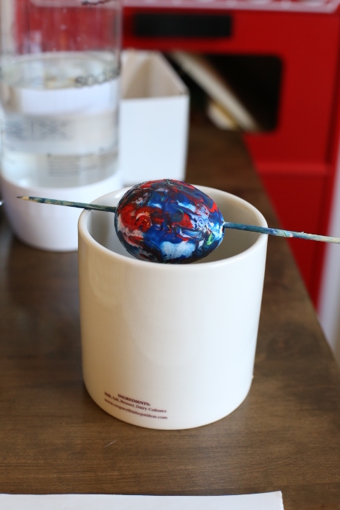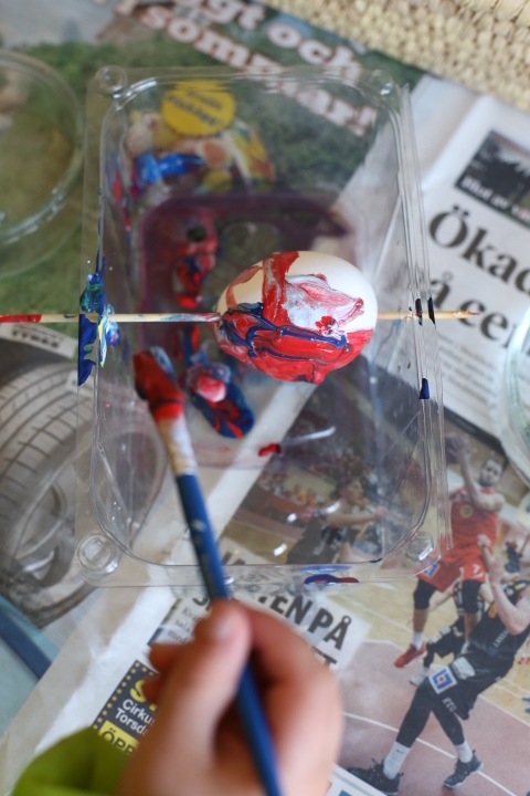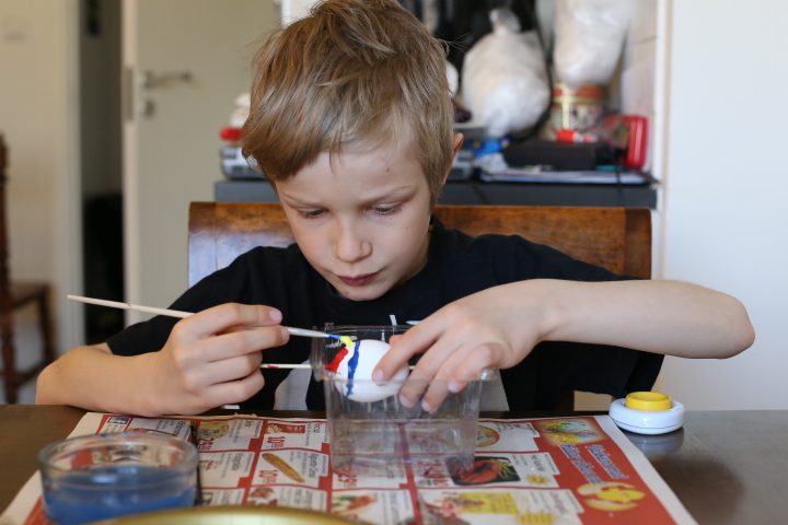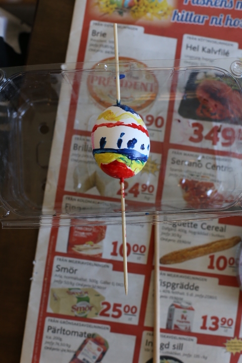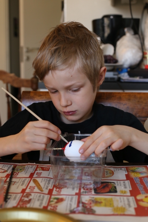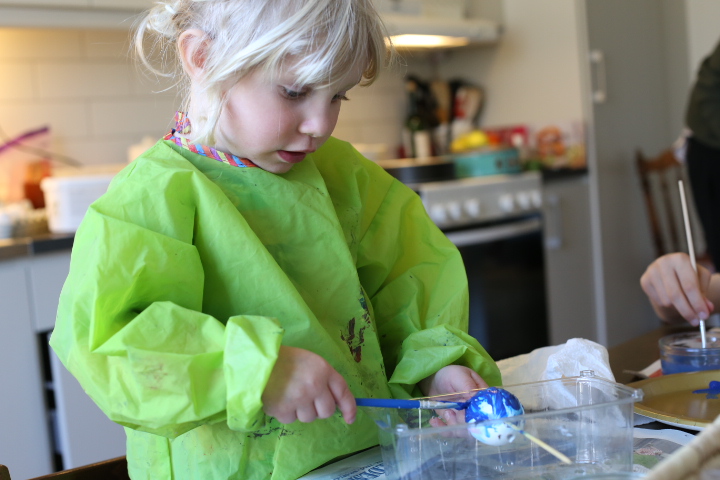 Emma L-I-E-B-T es zu malen und ob es nun Ostereier sind oder nicht, das Motto lautet immer „Her mit der Farbe!“. Selbstverständlich kann sie da so noch nicht sagen, aber das Persönchen kann sich auch halb-verbal sehr genau ausdrücken. Das Ostereiermalen war das reinste Chaos. András war mit dem Kuchenbacken beschäftigt und ich versuchte gleichzeitig Eier auszublasen, Farbe auszuteilen, Wasser zu wechseln, Eier auf Stäbe aufzustecken, Chaos einzudämmen und nebenher auch noch mal schnell ein Bild zu machen. Kaum fertig, rannte Emma mit Händen voller Farbe in das Wohnzimmer um hinter dem Sofa eine Pfütze auf den Boden zu machen. Nein, es war keine Wasserpfütze. Nachdem alles einigermassen weggeräumt war, wir das Mittagessen beendet und Emma im Bett war, landeten beide Eltern erst einmal völlig erschlagen auf Sofa oder Bett. Pause. Ohne Farbe. Ohne Pfützen. Ohne Geschrei. Ruhe. Her mit der Ruhe!
