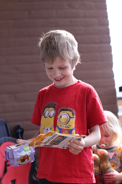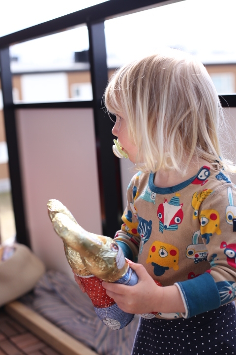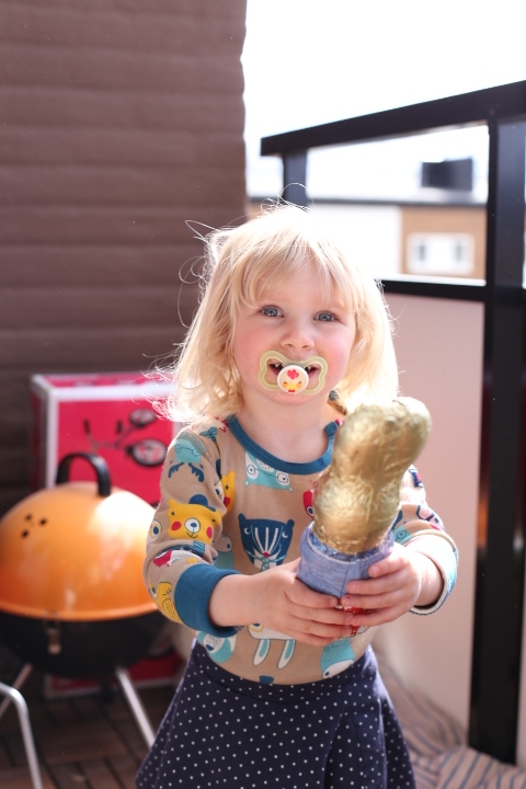 Albert fand, dass der Hase zwei hervorrangende Packungen Pokemon-Karten gebracht hatte und Emma war sehr zufrienden mit dem Laufrad. Besonders allerdings beschäftigte sie der Osterhase. Denn als ihrer bereits in kleinen Stuecken in einer Plastikdose war, da befand sich Albert’s Hase noch in einem intakten Zustand. Das war unakzeptabel. Nur mit Schwierigkeiten durfte Albert seinen Hasen essen.
