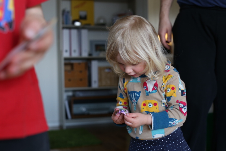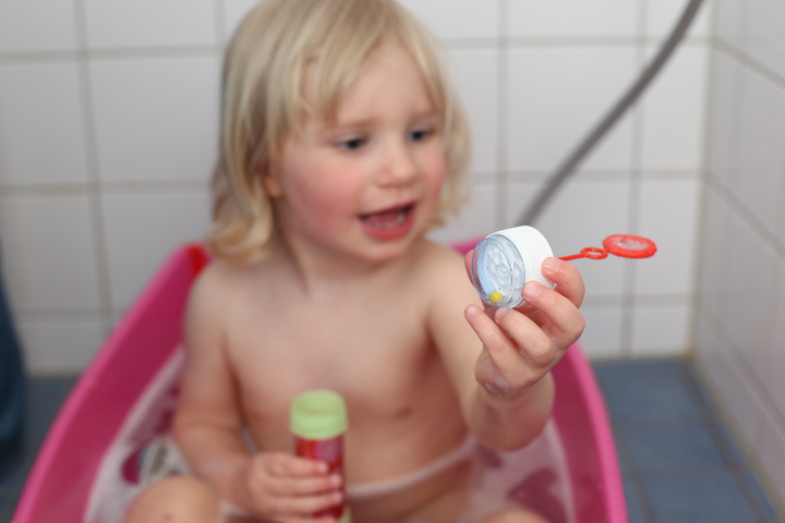 Emma ist momentan verrückt nach Seifenblasen. Und damit macht sie mich manchmal auch etwas verrückt. Denn wenn nicht sofort, auf der Stelle die Seifenblasen gemacht werden können mit dem RICHTIGEN Behälter, dann gibt es schonmal den ein oder anderen Tobsuchtsanfall. Da wird geschrien und gehauen, Sachen umhergeworfen, gezogen, geschubst und was nicht noch alles dem starken Willen Ausdruck verleiht. Obwohl ich theoretisch gut genug weiss, wie man sich am besten verhalten sollte oder nicht, bin ich doch oft genug machtlos, wenn die Müdigkeit oder die vielen Dinge, die es zu tun gibt, sich vermischen mit einem Wutanfall. Besonders wenn der Papa für ein paar Tage im „belgischen Exil“ ist. Zum Glück wird er in ein paar Stunden wieder da sein. Denn wenn sich die Wutanfälle auf zwei Personen verteilen, dann wird alles leichter. Fast so leicht wie Seifenblasen.