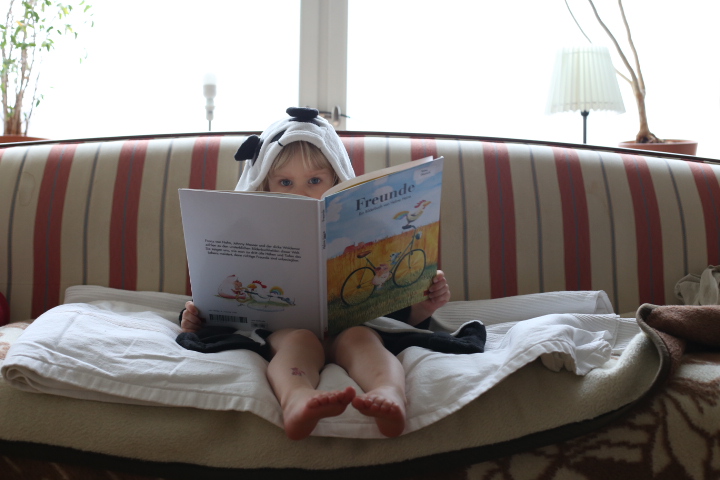 Nachdem irgendwie jeder (ausser András) in den letzten 4 Wochen irgendwie krank war und es leider kaum irgendeine Routine gab, hatte es Emma am Wochenende doch auch erwischt: Windpocken. Sie ist die ganze Woche zuhause und wir suchen nach allen möglichen Tätigkeiten, sie bei Laune zu halten. Zwischendurch spielt sie an einem guten Tag auch mal 20 Minuten alleine – das ist grossartig. Das tägliche Repoirtoire ist bunt. Malen und zeichnen, lesen, kneten, wild umherspringen, mit Bauklötzen oder Lego bauen, in ihrer Kueche leckere Mahlzeiten zubereiten, in ihrem aufblasbaren Gummibadeboot im Bad baden, singen und ab und an doch auch mal ein paar Filmchen sehen. Selbstverständlich haben wir auch einen Einkauf gemacht, Wäsche gewachen und die ein oder andere Sache durch die Zimmer getragen. Die Windpocken verliefen gänzlich ohne Fieber, Emma hat viel weniger Pocken als Albert (hatte) und – abgesehen von etwas unruhigen Nächten und Juckreiz beim Schlafen – hat man kaum das Gefuehl, dass sie in irgendeiner Art und Weise eingeschränkt wäre oder ihr Energievorrat leer werden wuerde….